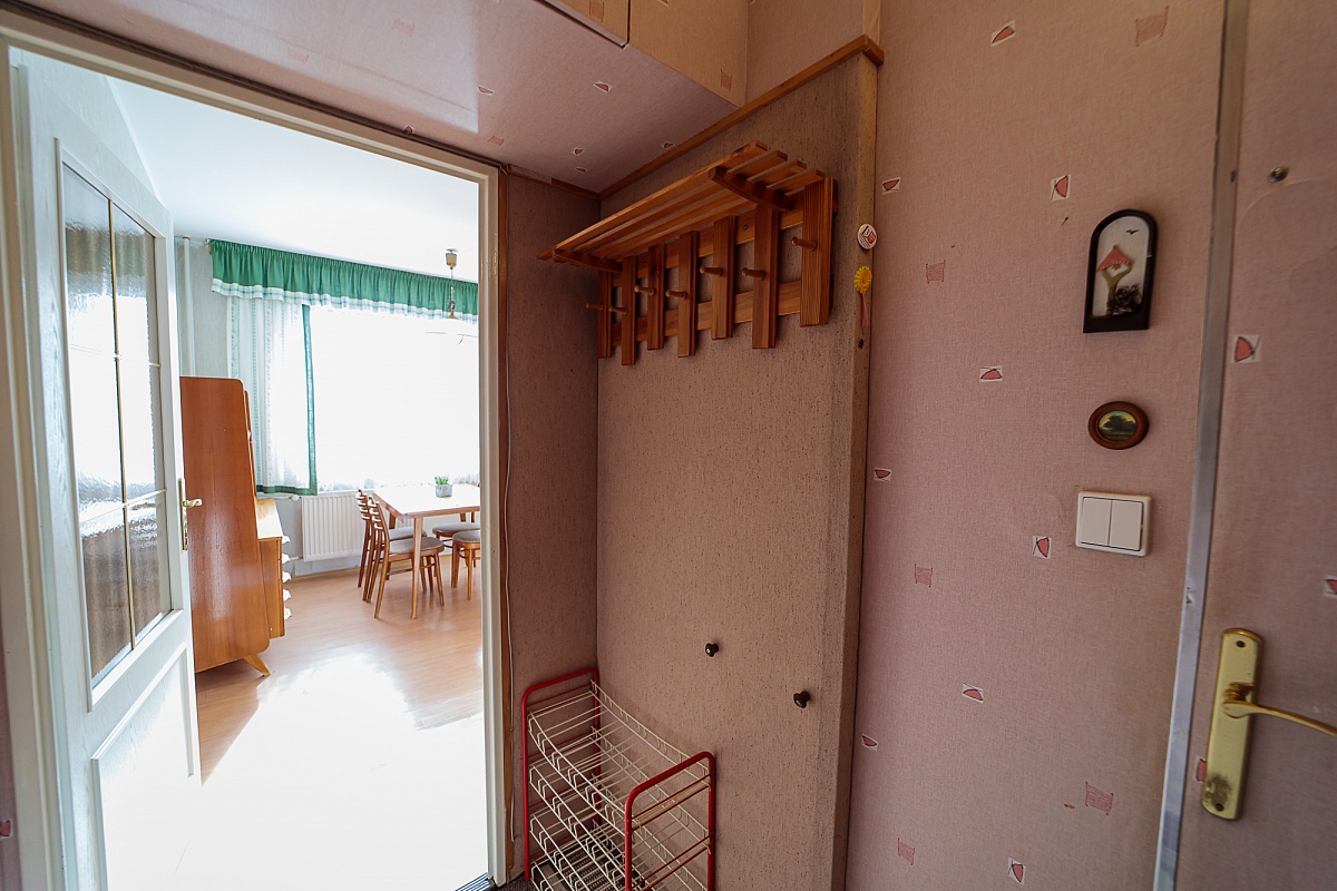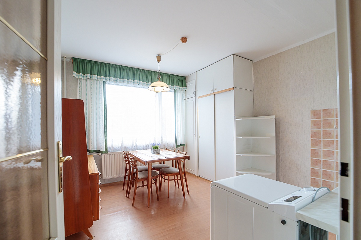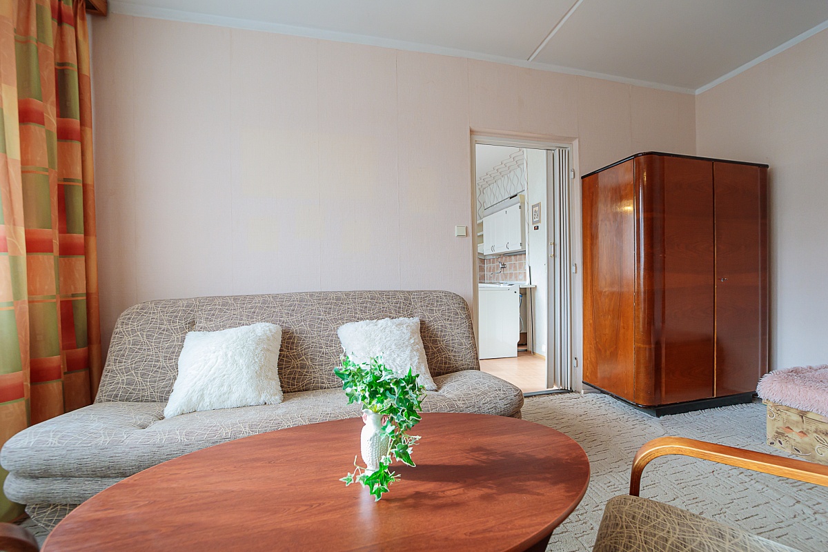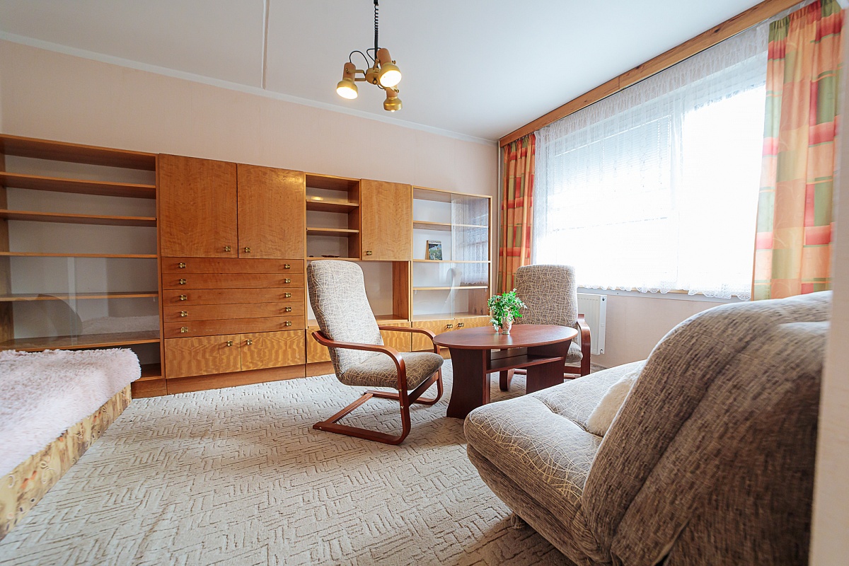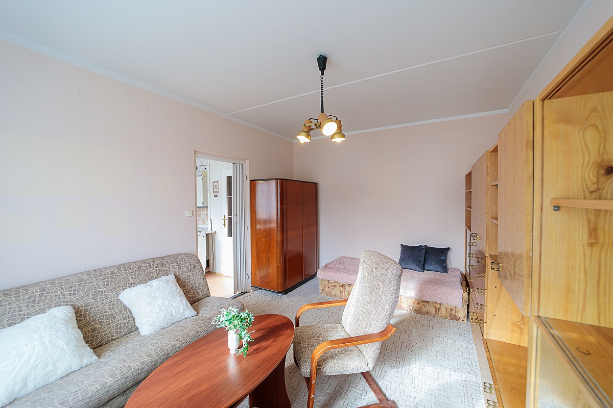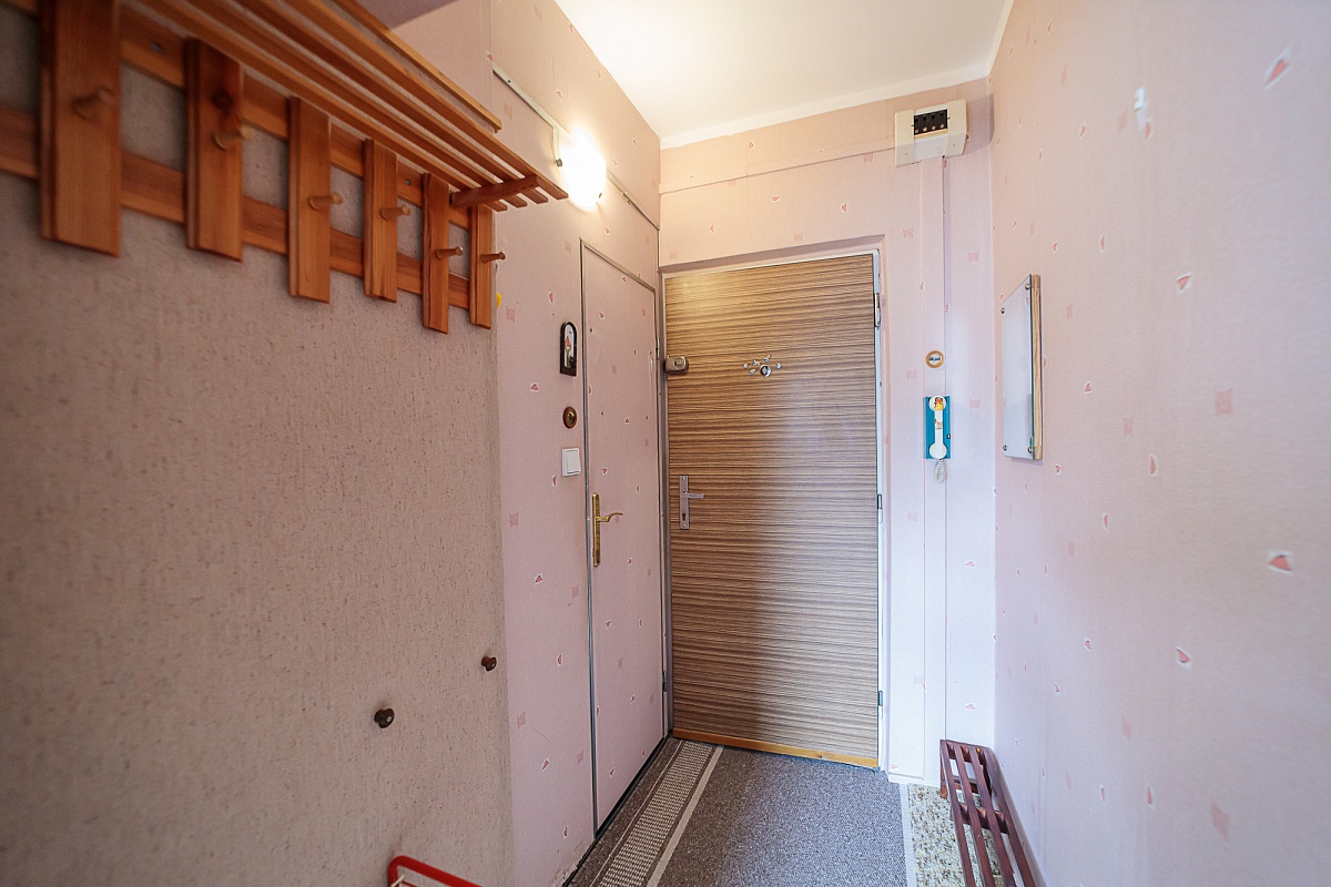 Byt je tvořen z jedné obytné místnosti, kuchyně s kuchyňskou linkou, koupelny a chodby. V koupelně je sprcha, umyvadlo a WC. Podlahovou krytinou je lino, koberec a dlažba. V bytě jsou již plastová okna. K bytu patří i sklepní kóje.