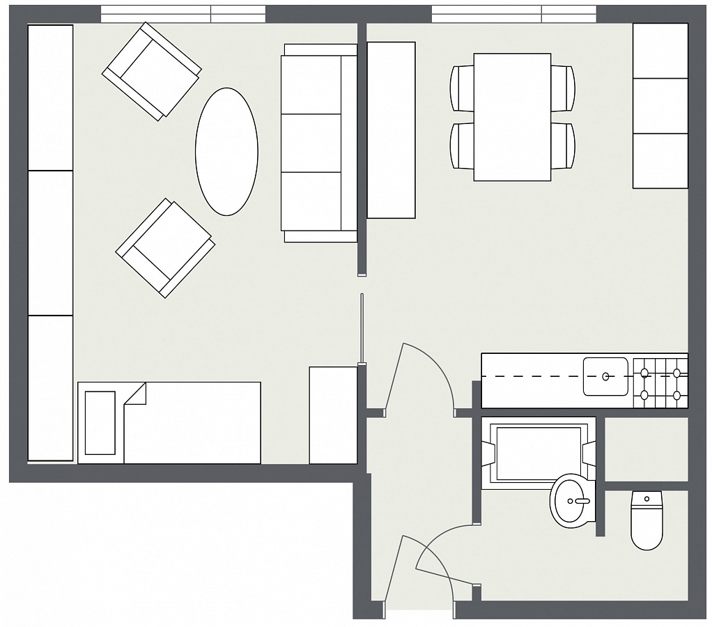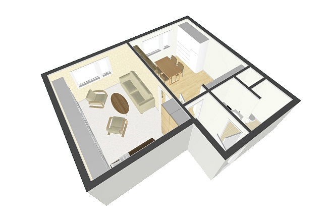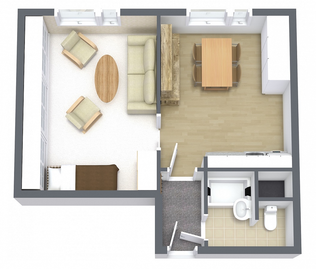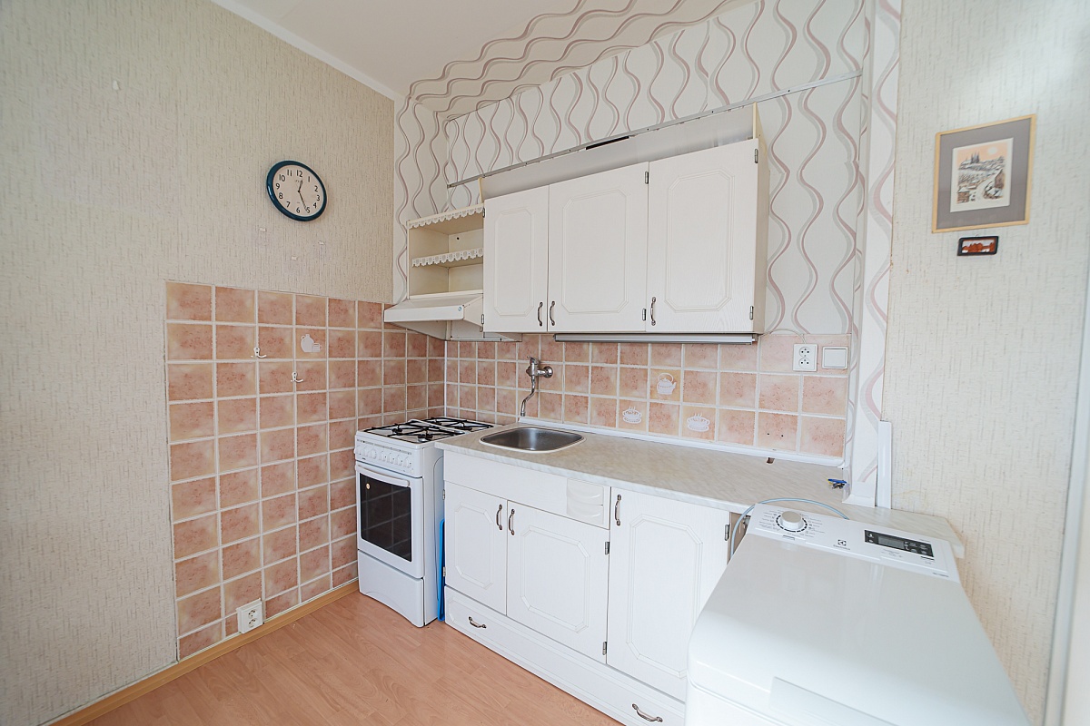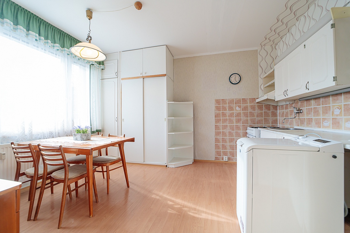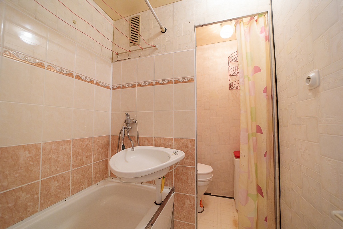 Byt je tvořen z jedné obytné místnosti, kuchyně s kuchyňskou linkou, koupelny a chodby. V koupelně je sprcha, umyvadlo a WC. Podlahovou krytinou je lino, koberec a dlažba. V bytě jsou již plastová okna. K bytu patří i sklepní kóje.