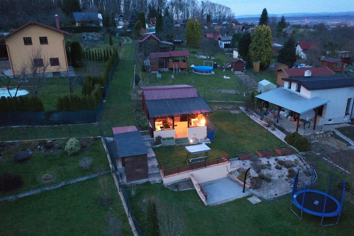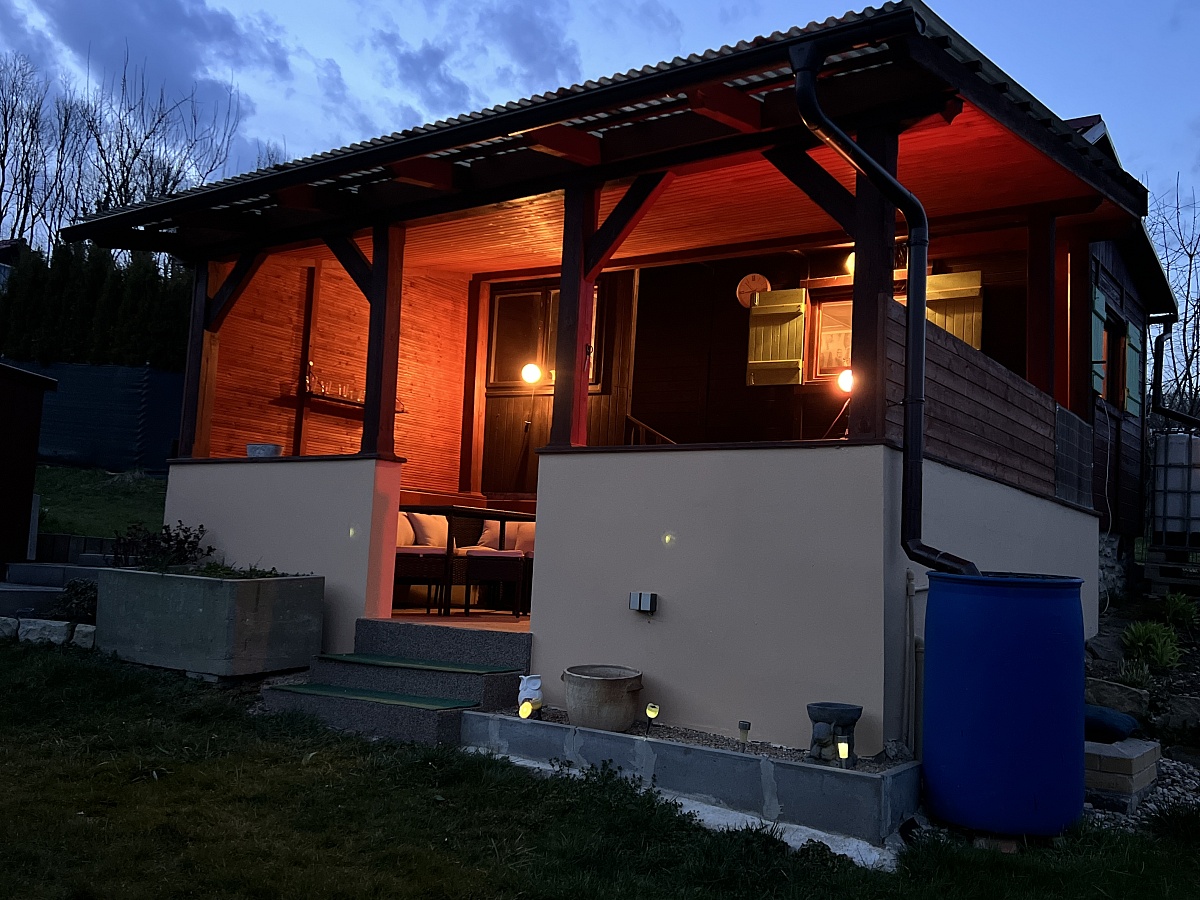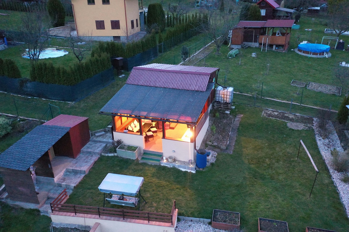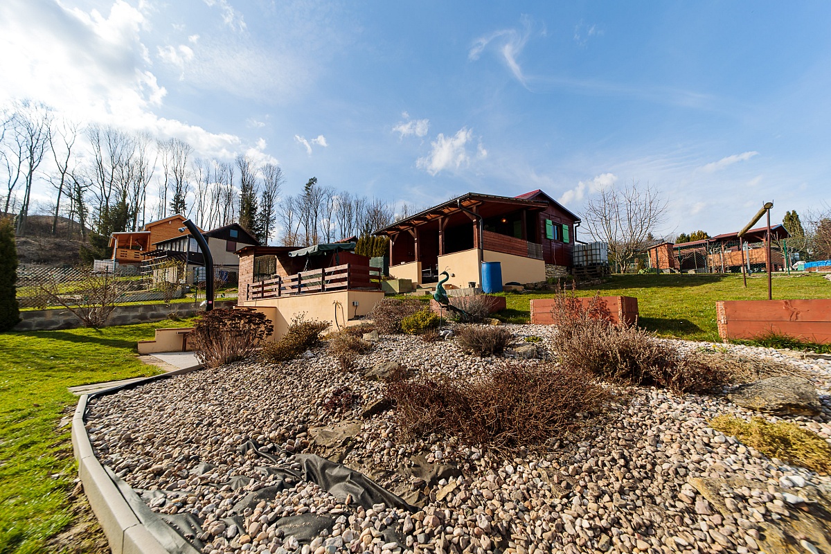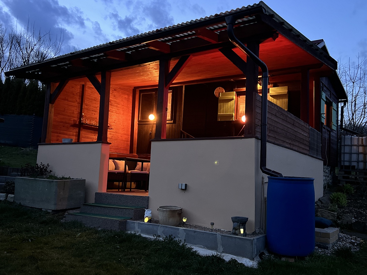 Na zahradě je pěkné připravené místo na strávení klidných teplých dní. Je zde místo pro bazén nebo vířivku, venkovní sprcha, ohniště. Celá kolonie je oplocená. Příjezd automobilem je možný nedaleko chaty.