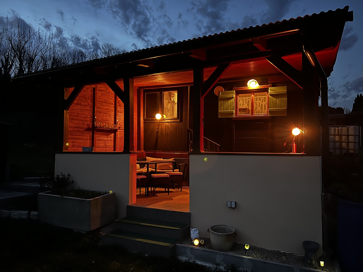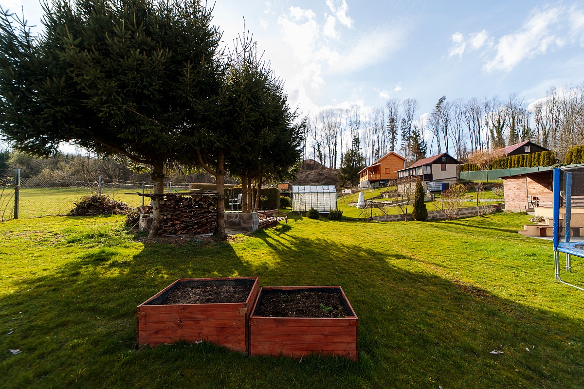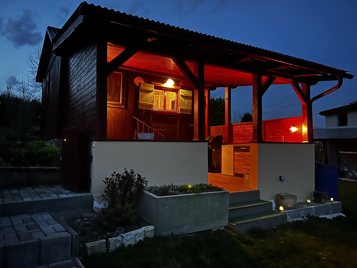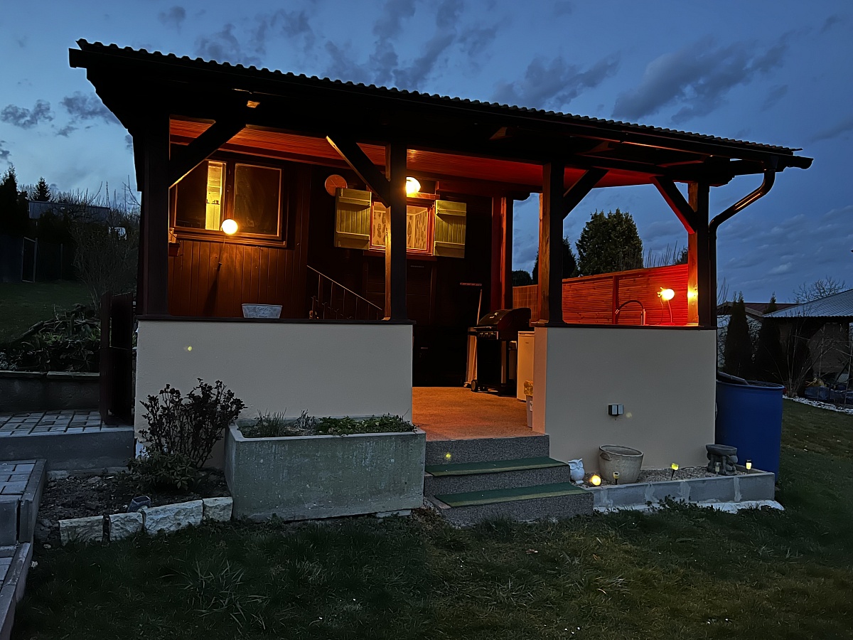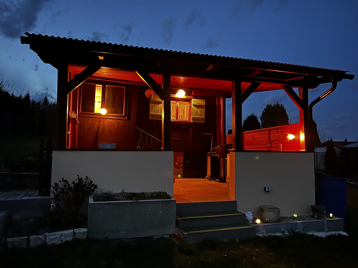 Na zahradě je pěkné připravené místo na strávení klidných teplých dní. Je zde místo pro bazén nebo vířivku, venkovní sprcha, ohniště. Celá kolonie je oplocená. Příjezd automobilem je možný nedaleko chaty.