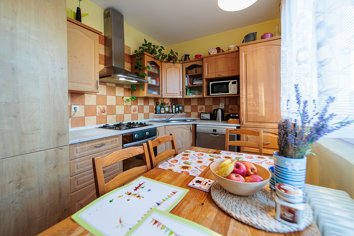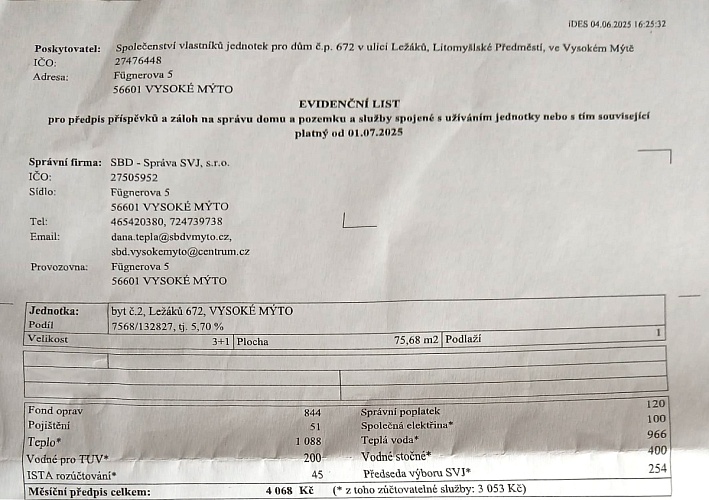 Nabízíme Vám k prodeji prostorný byt 3+1 v ul. Ležáků ve Vysokém Mýtě – Litomyšlském Předměstí. Byt o velikosti 75 m² se nachází v 1. patře revitalizovaného domu a tvoří ho kuchyň s rohovou kuchyňskou linkou a s vestavěnými spotřebiči, obývací pokoj, dětský pokoj, ložnice, vyzděná koupelna s vanou, samostatné WC a chodba s vestavěnou skříní. Součástí bytu je také komora. V roce 2005 proběhla rekonstrukce koupelny a WC. Podlahové krytiny – lino a dlažba. V kuchyni, koupelně, na chodbě a na WC jsou sádrokartonové stropy. Výhled z kuchyně a z dětského pokoje je do zeleně. V suterénu domu je k dispozici sklep. Panelový dům je po celkové revitalizaci, je zateplený, má novou fasádu a plastová okna, nové stoupačky, výtah a střechu. Výhodou jsou nízké provozní měsíční náklady.