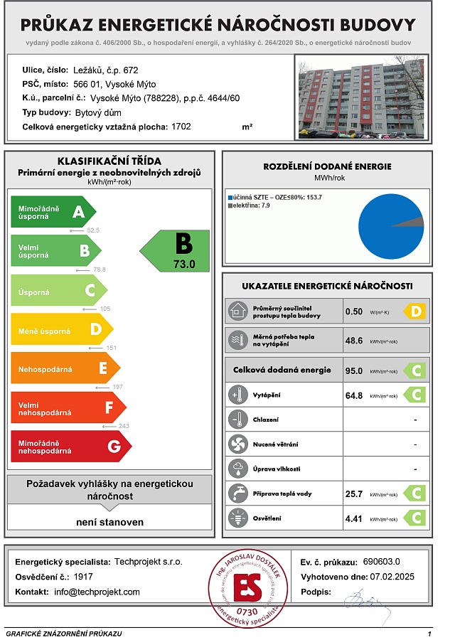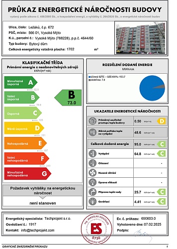 K této nemovitosti je zpracovaný energetický štítek, který je v energetické třídě B. Nemovitost je v osobním vlastnictví, proto v rámci našich služeb zájemci rádi zajistíme zdarma výhodné financování.