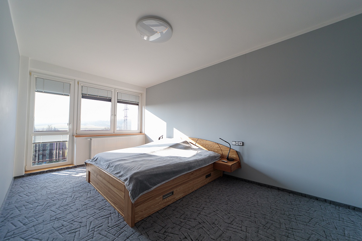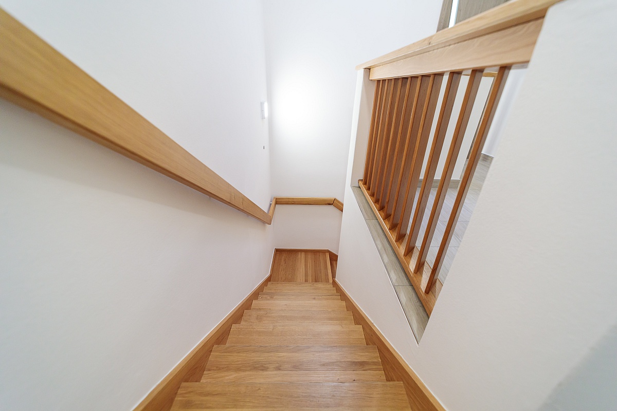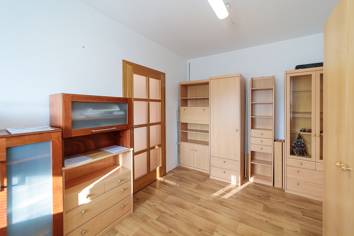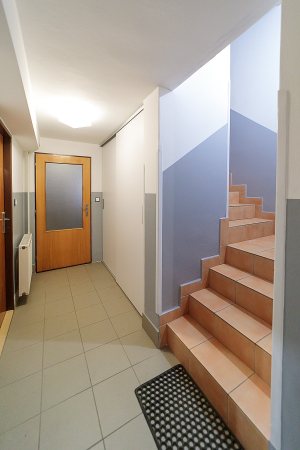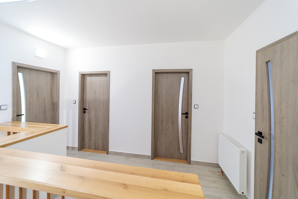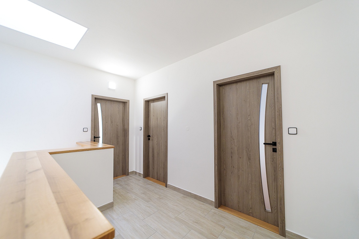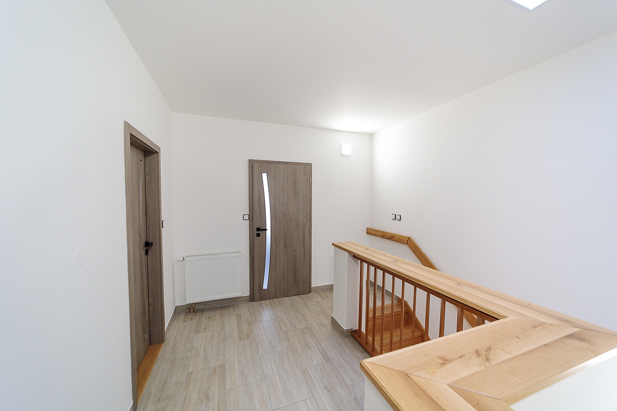 V patře se pak nachází tři obytné místnosti, všechny s přístupem na balkóny a koupelna. Koupelna je vybavena sprchovým koutem, vanou, umyvadlem a záchodem. Všechny místnosti mají jako podlahovou krytinu plovoucí podlahu nebo koberec, v koupelně je dlažba. Místnosti mají nové obložkové dřevěné dveře.