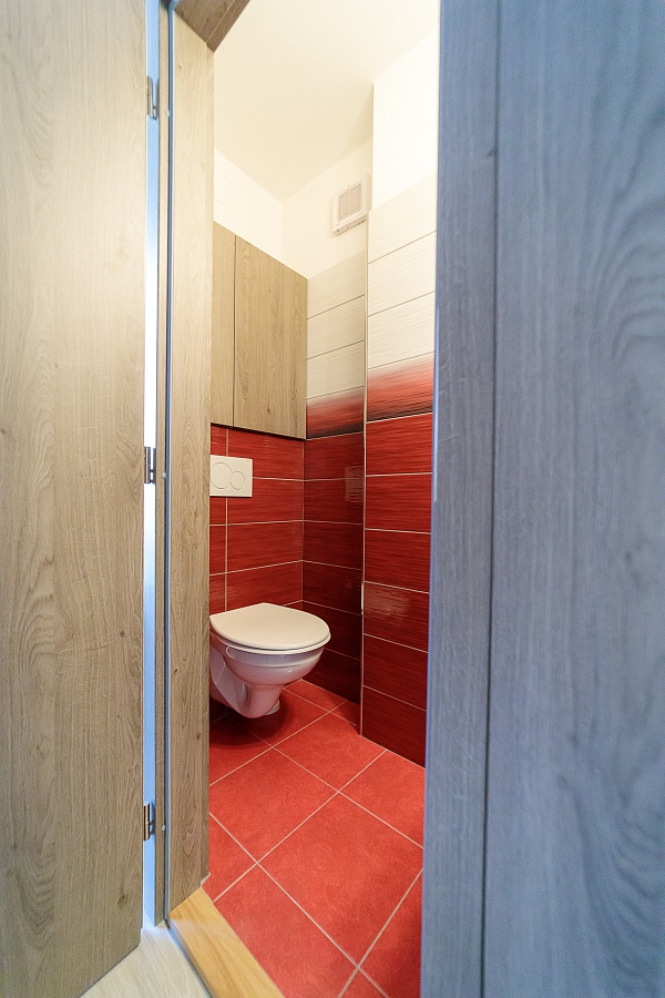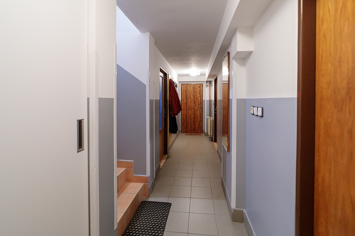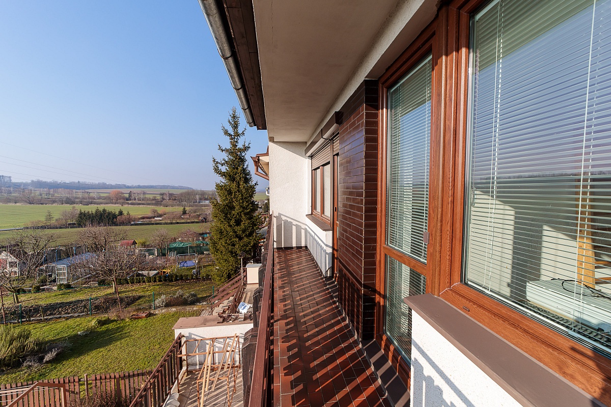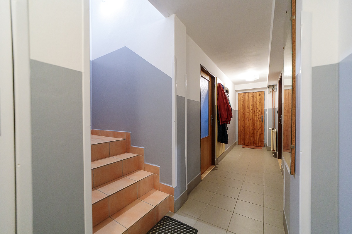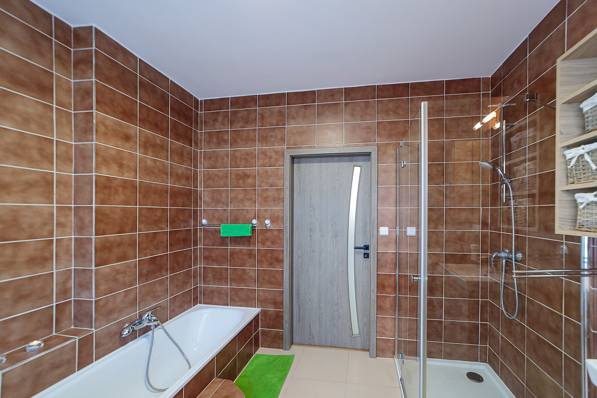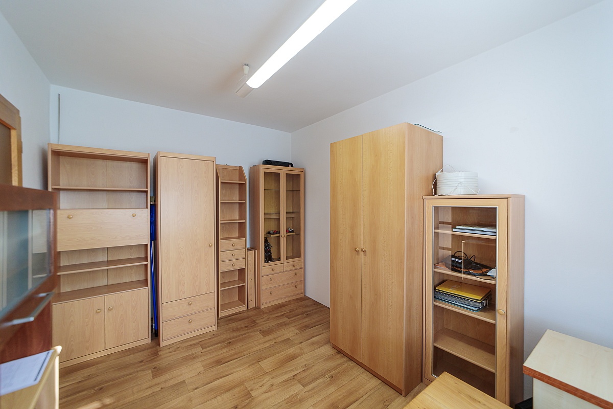 V patře se pak nachází tři obytné místnosti, všechny s přístupem na balkóny a koupelna. Koupelna je vybavena sprchovým koutem, vanou, umyvadlem a záchodem. Všechny místnosti mají jako podlahovou krytinu plovoucí podlahu nebo koberec, v koupelně je dlažba. Místnosti mají nové obložkové dřevěné dveře.