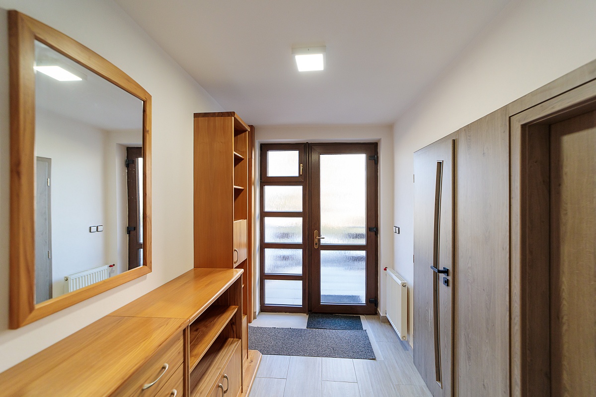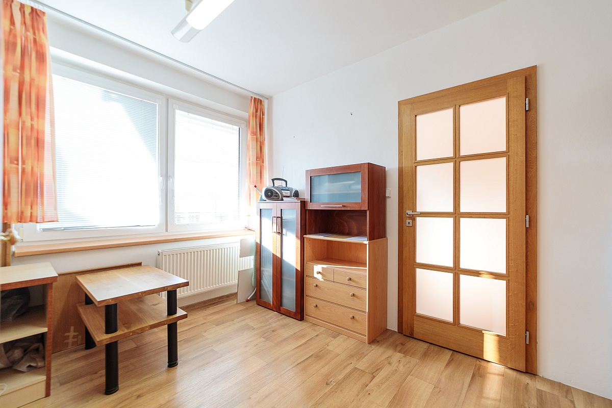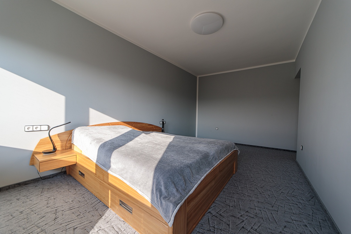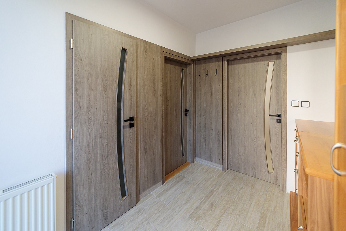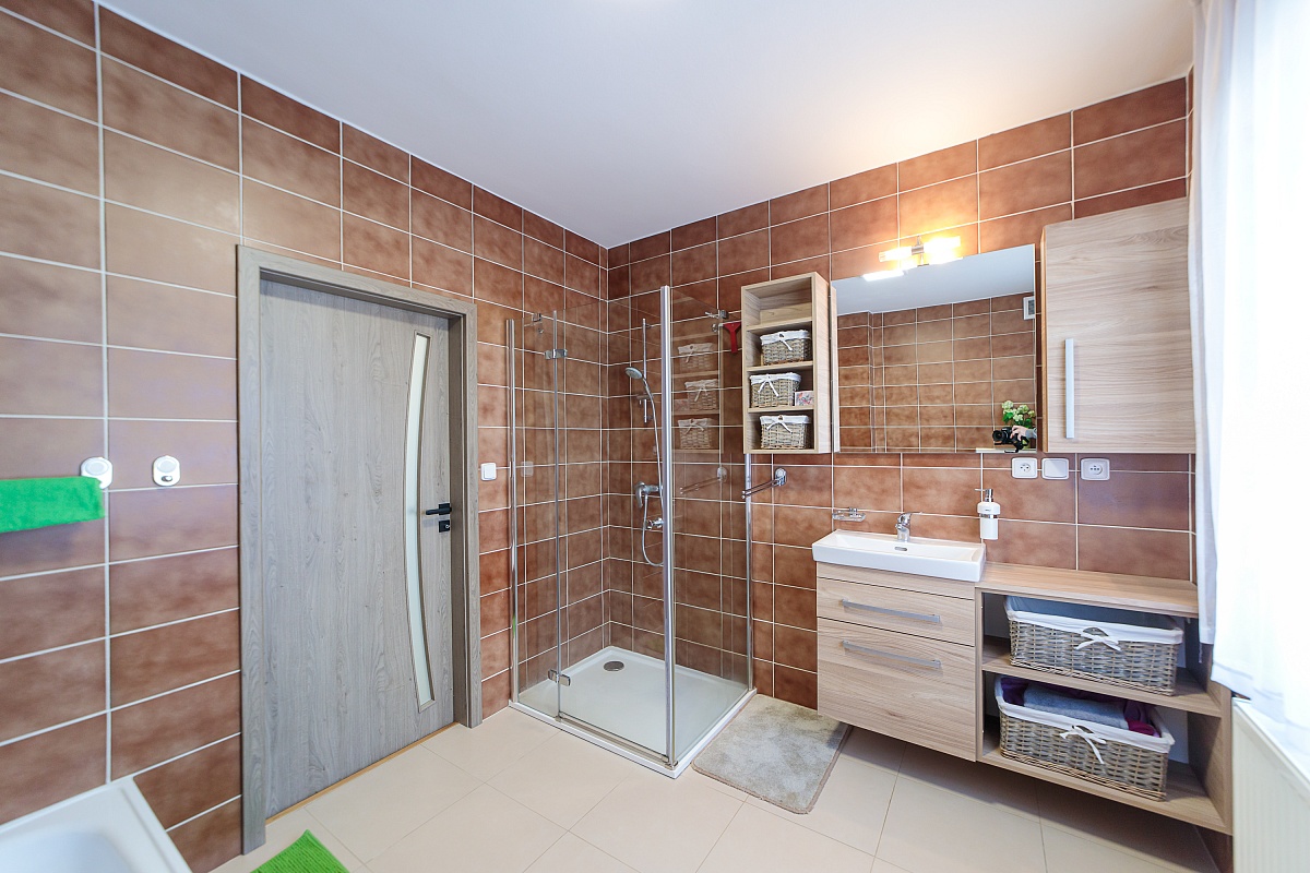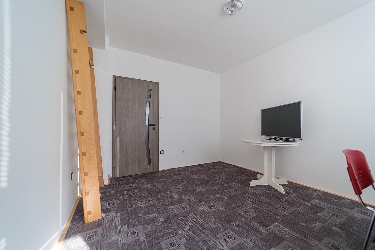 V patře se pak nachází tři obytné místnosti, všechny s přístupem na balkóny a koupelna. Koupelna je vybavena sprchovým koutem, vanou, umyvadlem a záchodem. Všechny místnosti mají jako podlahovou krytinu plovoucí podlahu nebo koberec, v koupelně je dlažba. Místnosti mají nové obložkové dřevěné dveře.