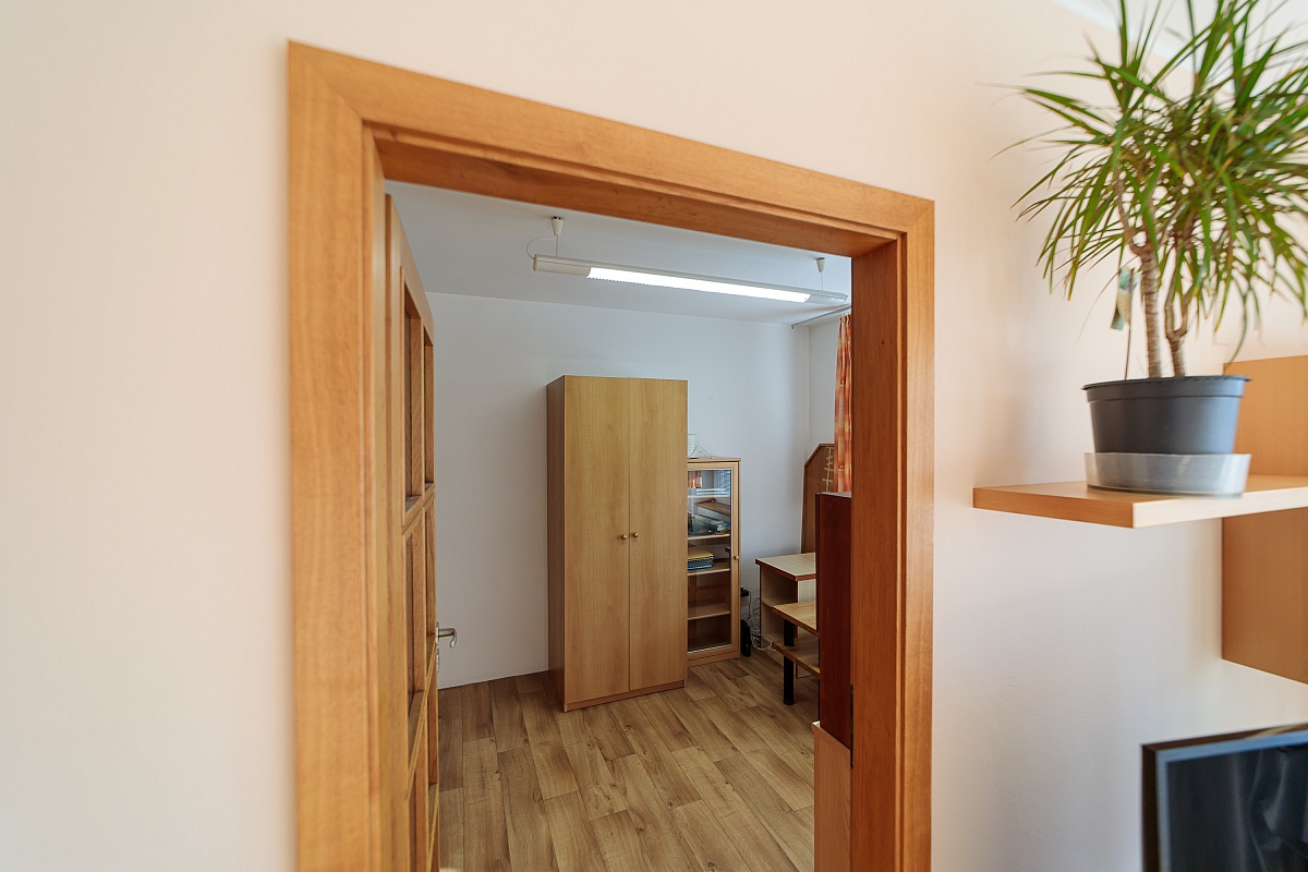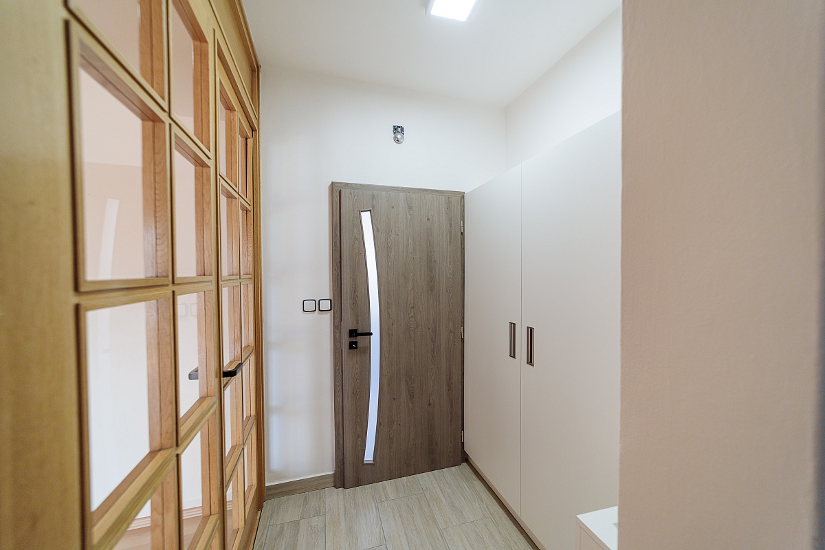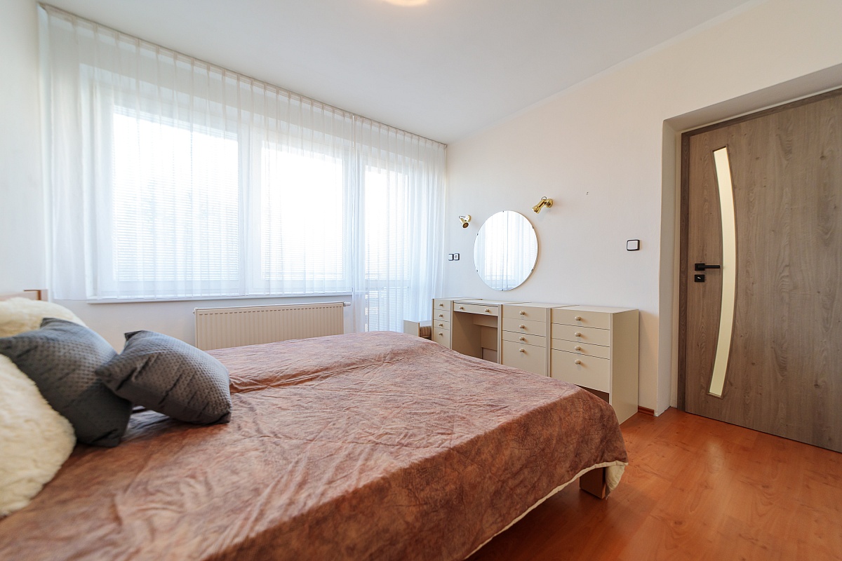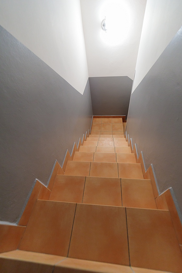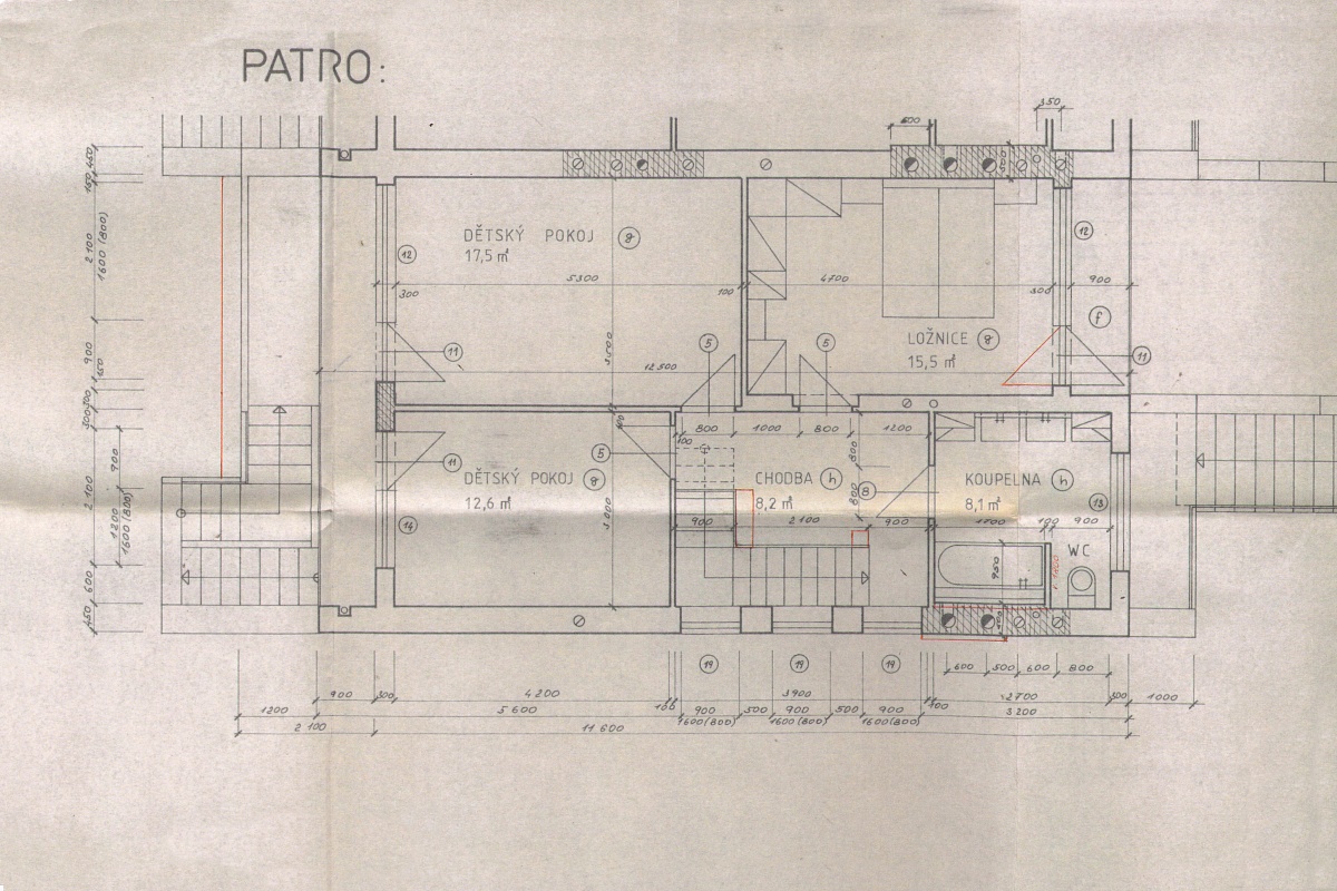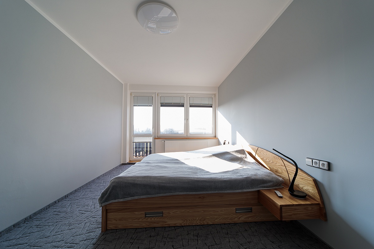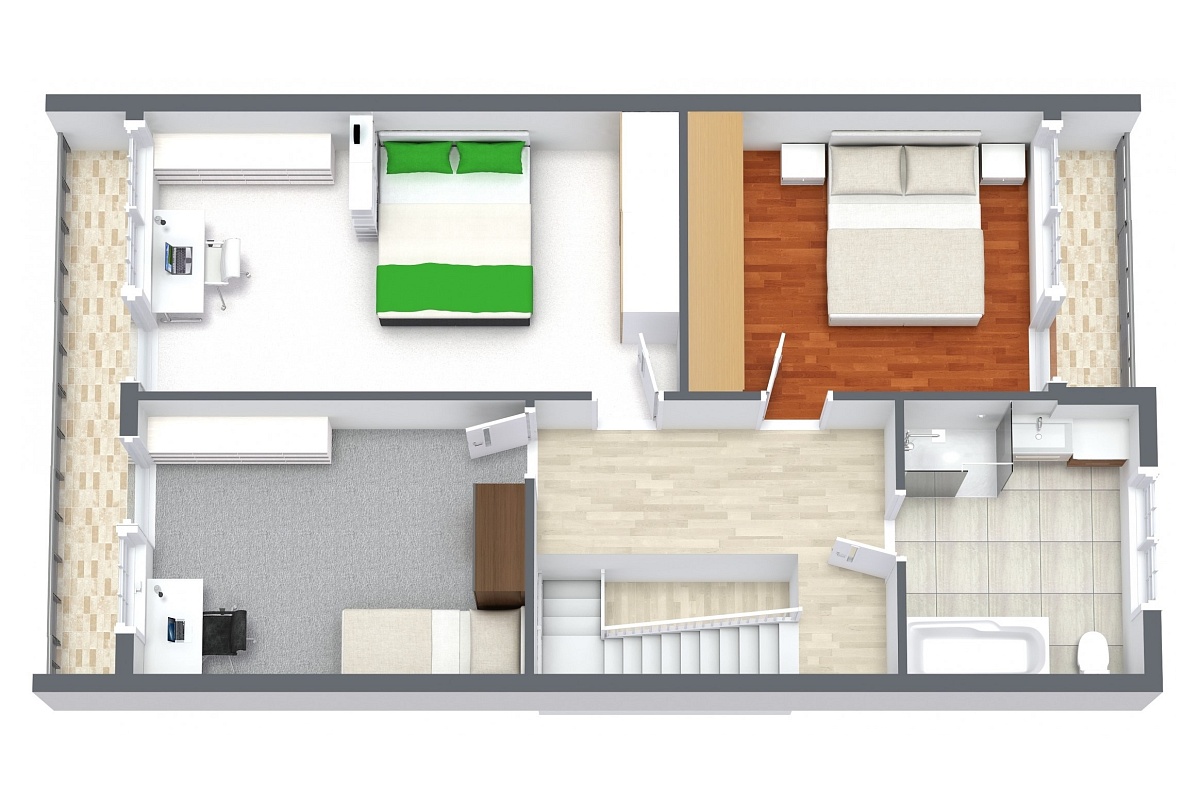 V patře se pak nachází tři obytné místnosti, všechny s přístupem na balkóny a koupelna. Koupelna je vybavena sprchovým koutem, vanou, umyvadlem a záchodem. Všechny místnosti mají jako podlahovou krytinu plovoucí podlahu nebo koberec, v koupelně je dlažba. Místnosti mají nové obložkové dřevěné dveře.