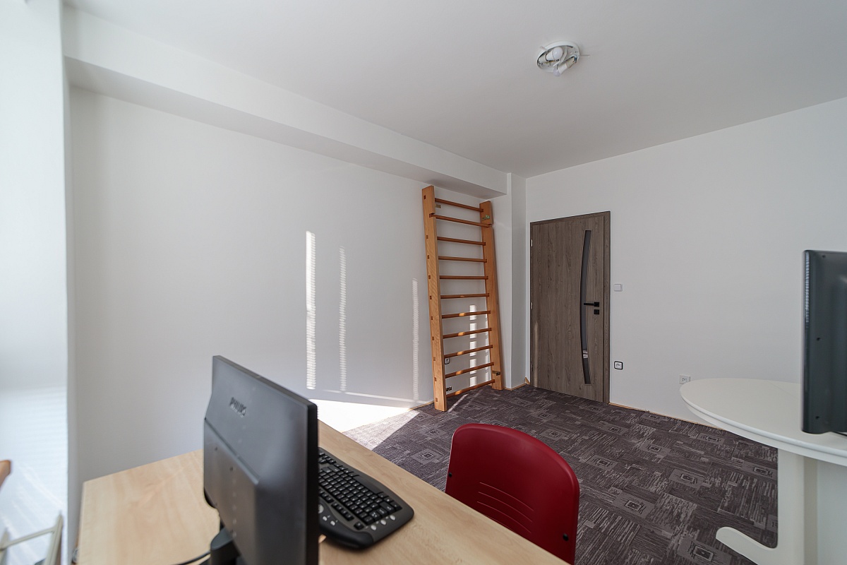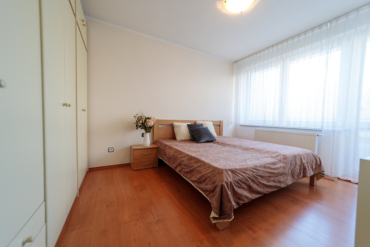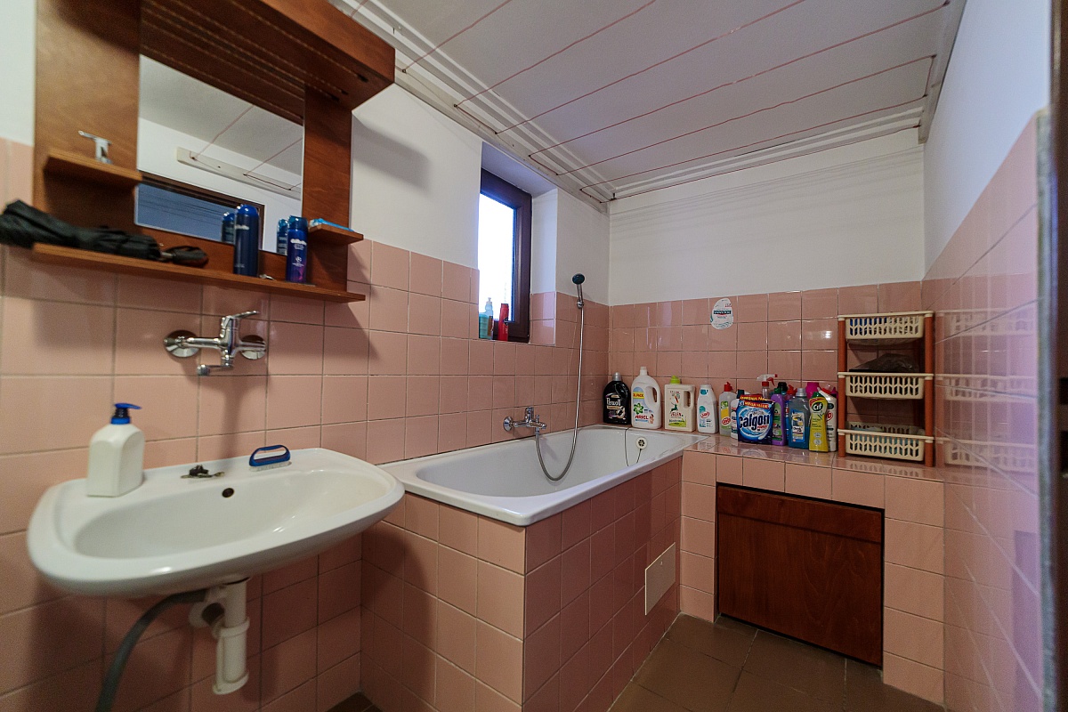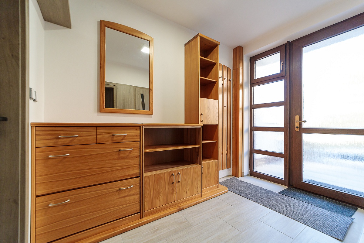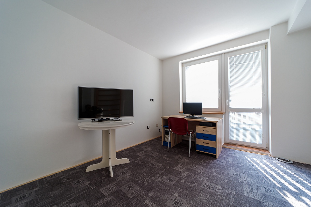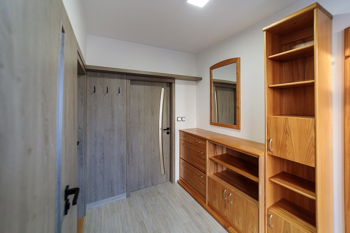 V patře se pak nachází tři obytné místnosti, všechny s přístupem na balkóny a koupelna. Koupelna je vybavena sprchovým koutem, vanou, umyvadlem a záchodem. Všechny místnosti mají jako podlahovou krytinu plovoucí podlahu nebo koberec, v koupelně je dlažba. Místnosti mají nové obložkové dřevěné dveře.