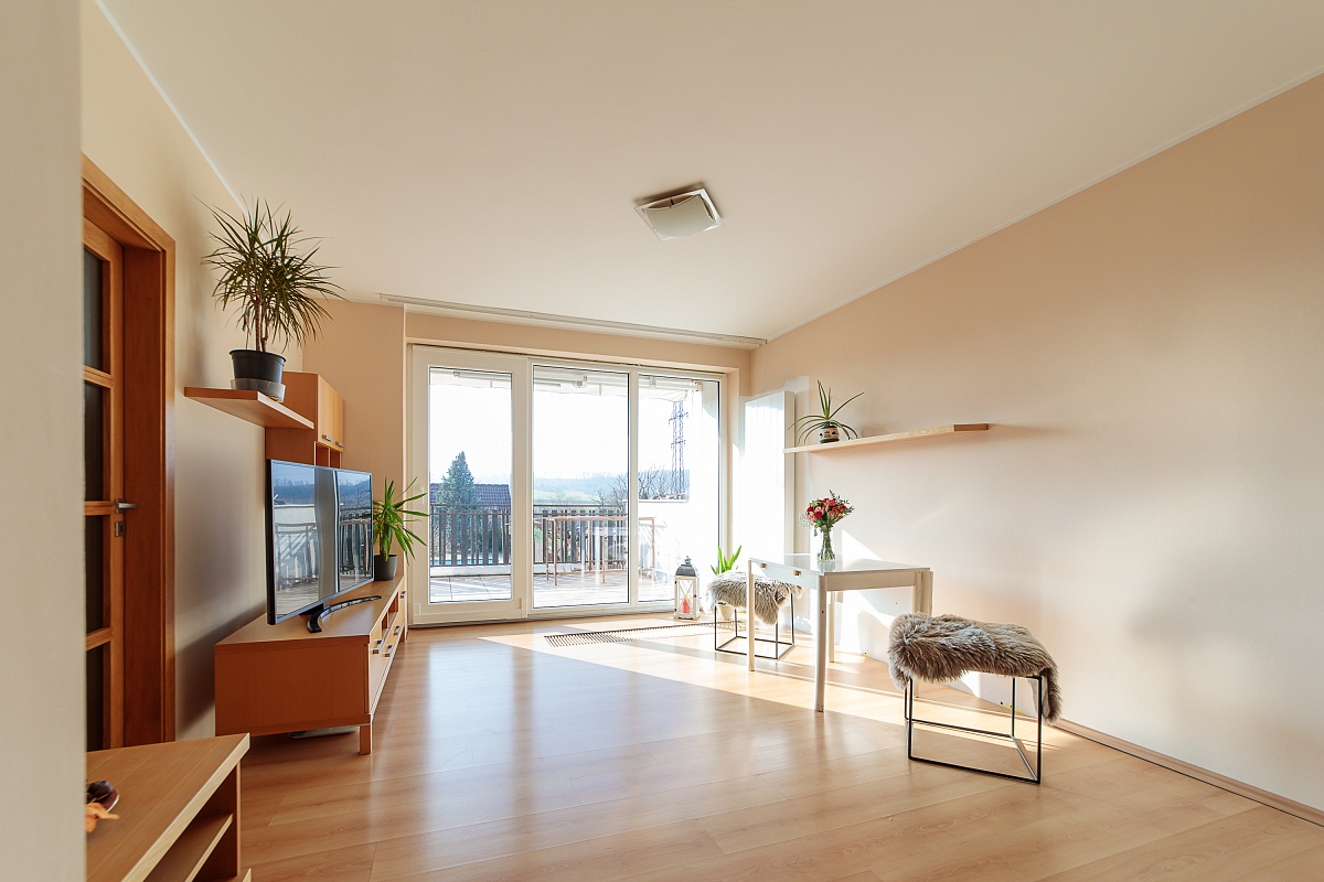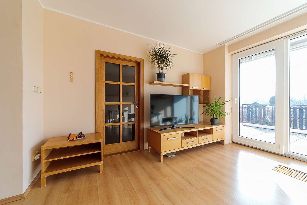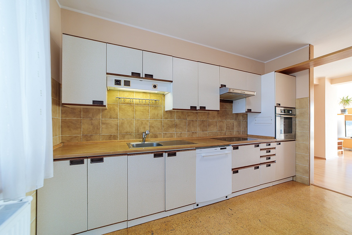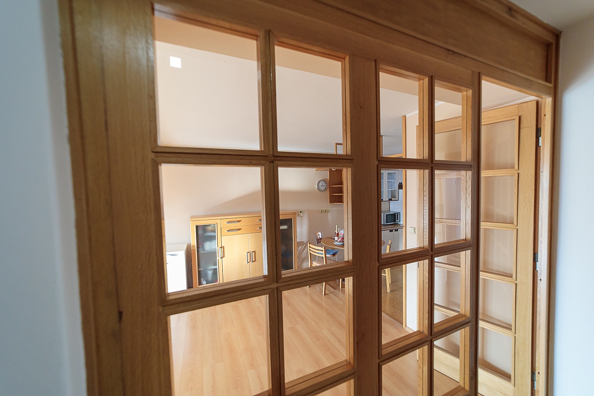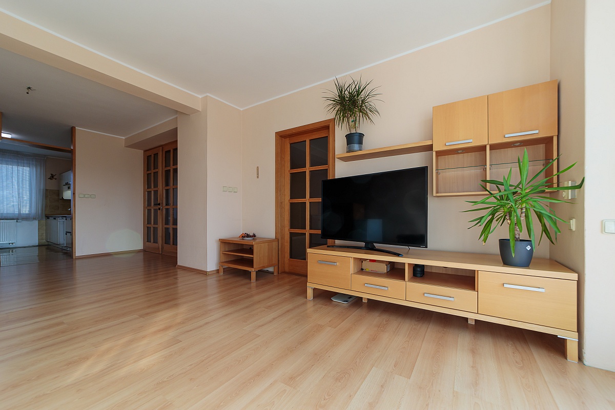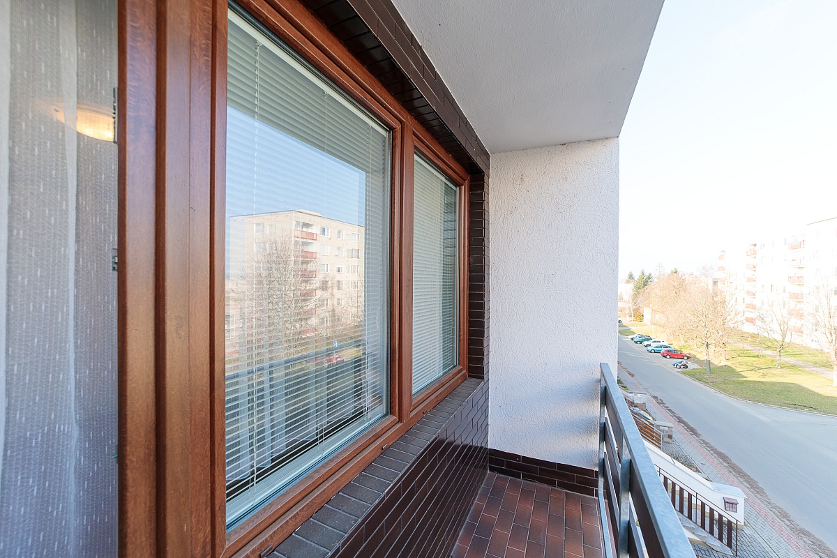 V patře se pak nachází tři obytné místnosti, všechny s přístupem na balkóny a koupelna. Koupelna je vybavena sprchovým koutem, vanou, umyvadlem a záchodem. Všechny místnosti mají jako podlahovou krytinu plovoucí podlahu nebo koberec, v koupelně je dlažba. Místnosti mají nové obložkové dřevěné dveře.