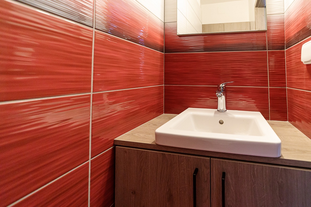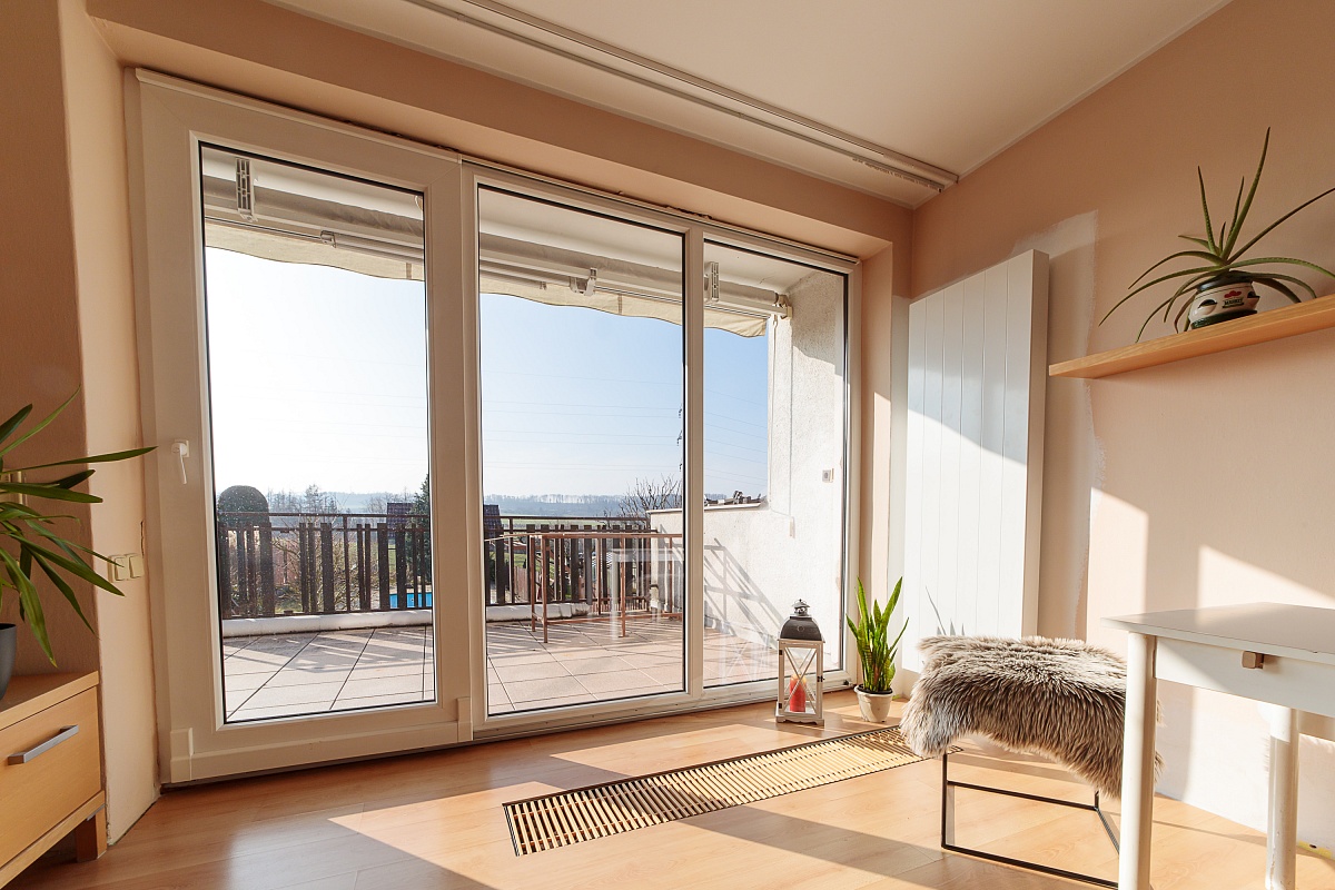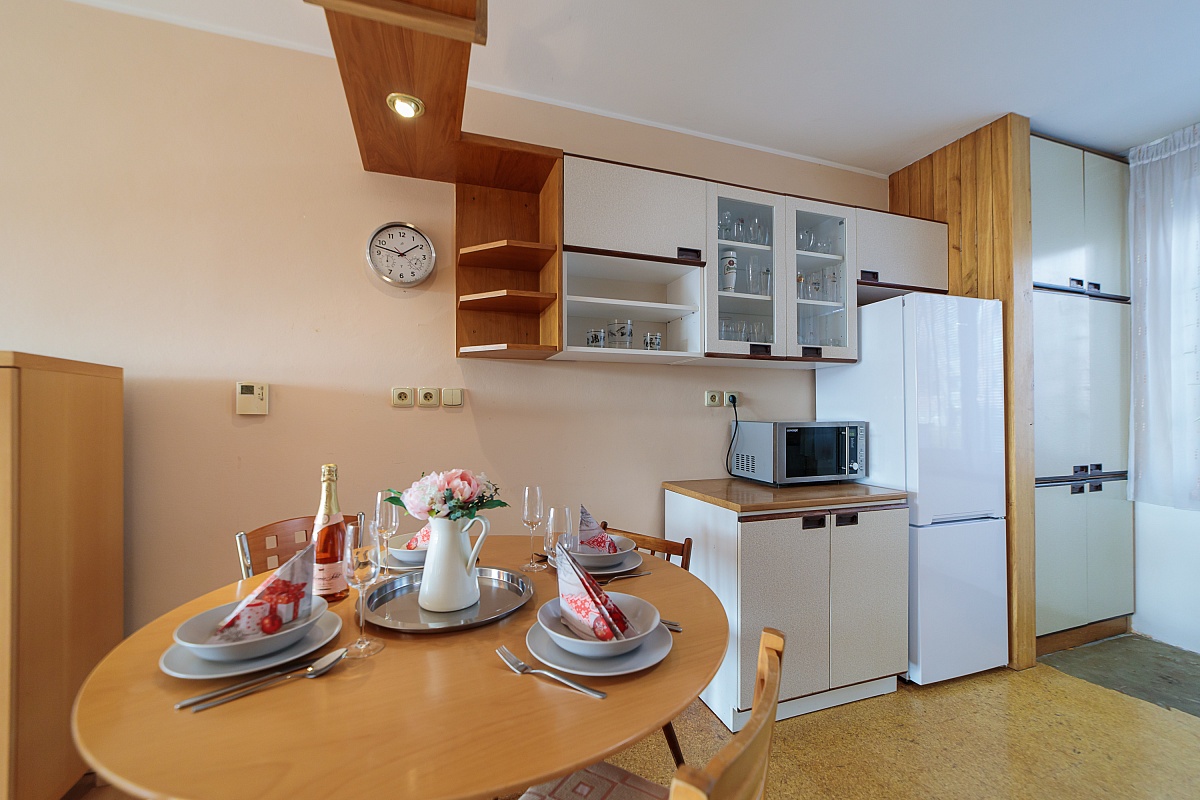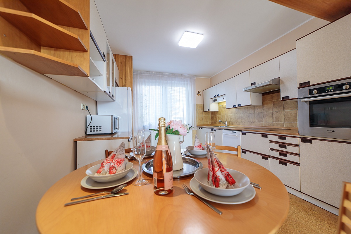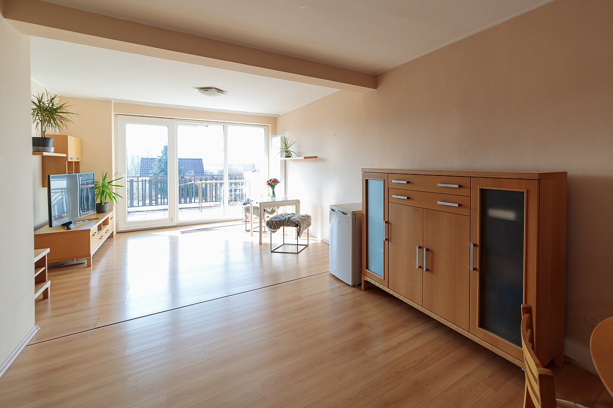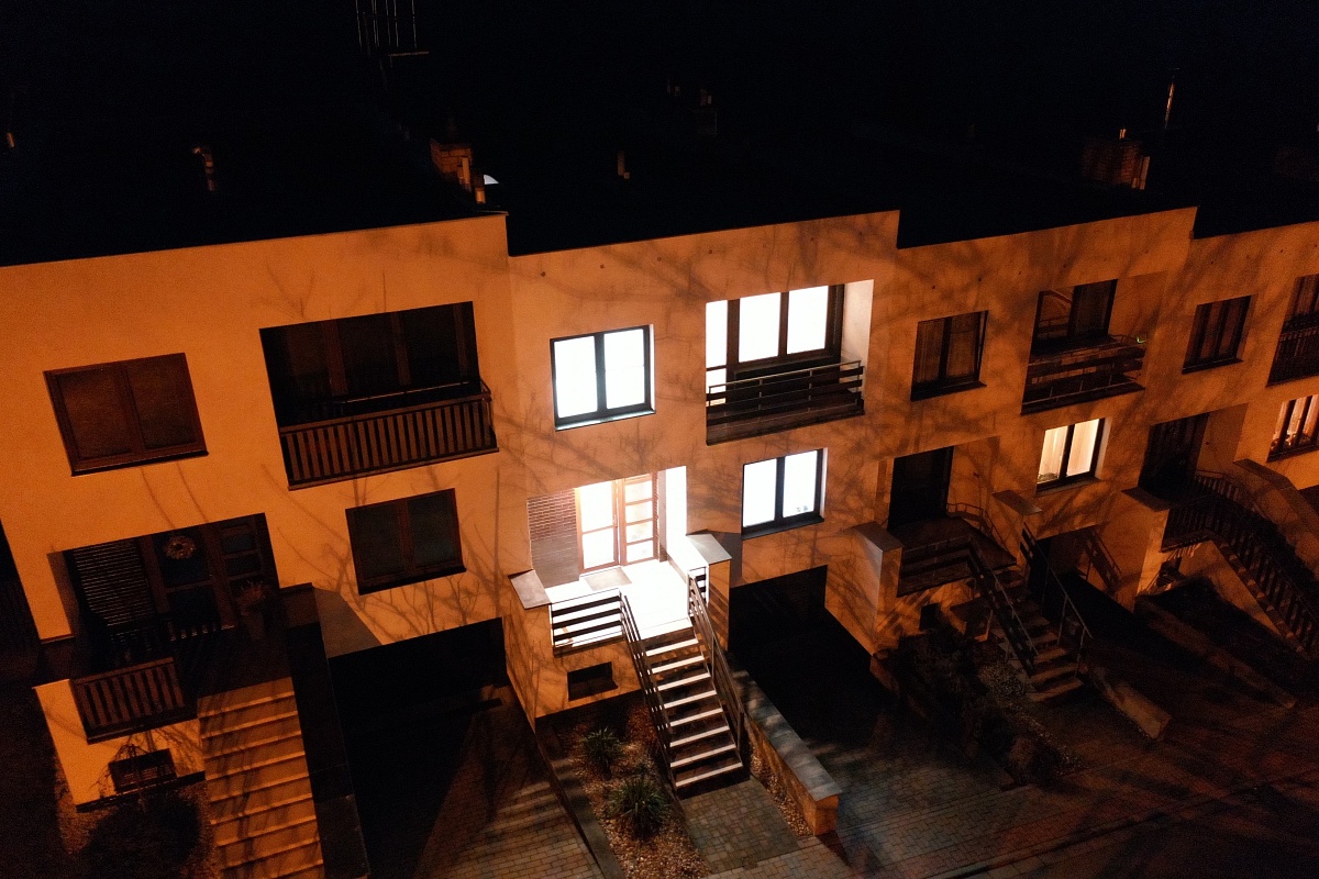 V patře se pak nachází tři obytné místnosti, všechny s přístupem na balkóny a koupelna. Koupelna je vybavena sprchovým koutem, vanou, umyvadlem a záchodem. Všechny místnosti mají jako podlahovou krytinu plovoucí podlahu nebo koberec, v koupelně je dlažba. Místnosti mají nové obložkové dřevěné dveře.