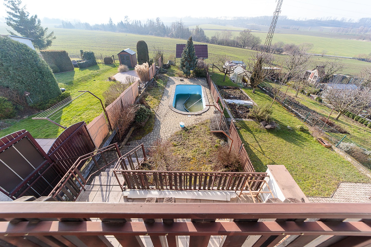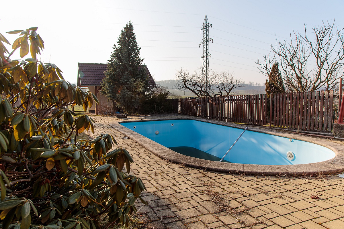 Zahrada za domem má cestu z dlaždic, zelenou část s možností osazení okrasných rostlin, velký zapuštěný bazén a zahradní domek.