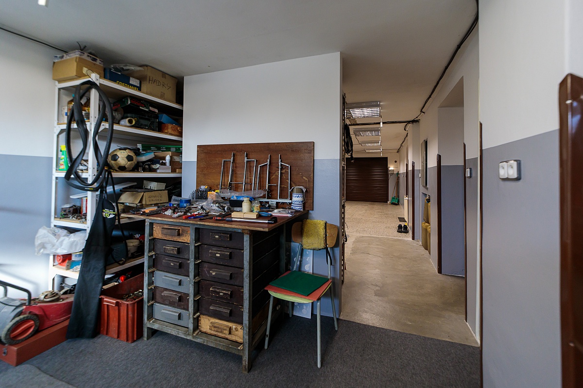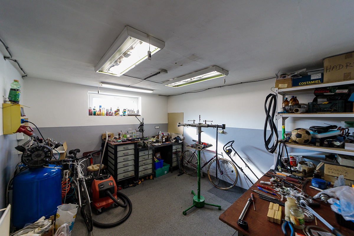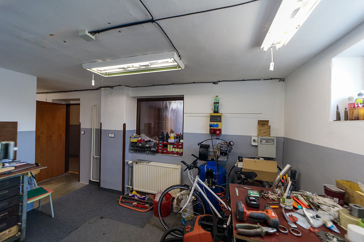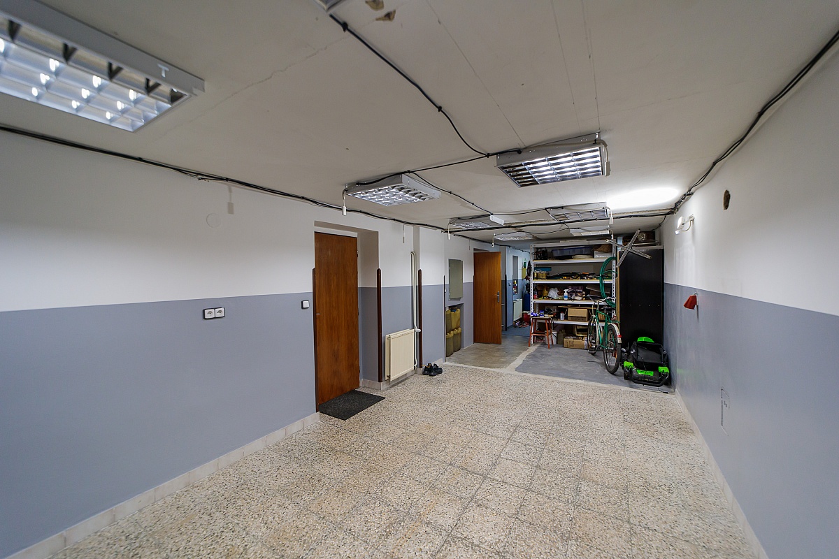 V suterénu domu se nachází garáž s elektrickými garážovými vraty na dálkové ovládání a dílna, oddělená od garáže příčkou a regálem. Dále se v suterénu nachází technická místnost, prádelna, WC, sklep a východ na zahradu, u kterého je ještě jeden sklep s vchodem zvenčí.