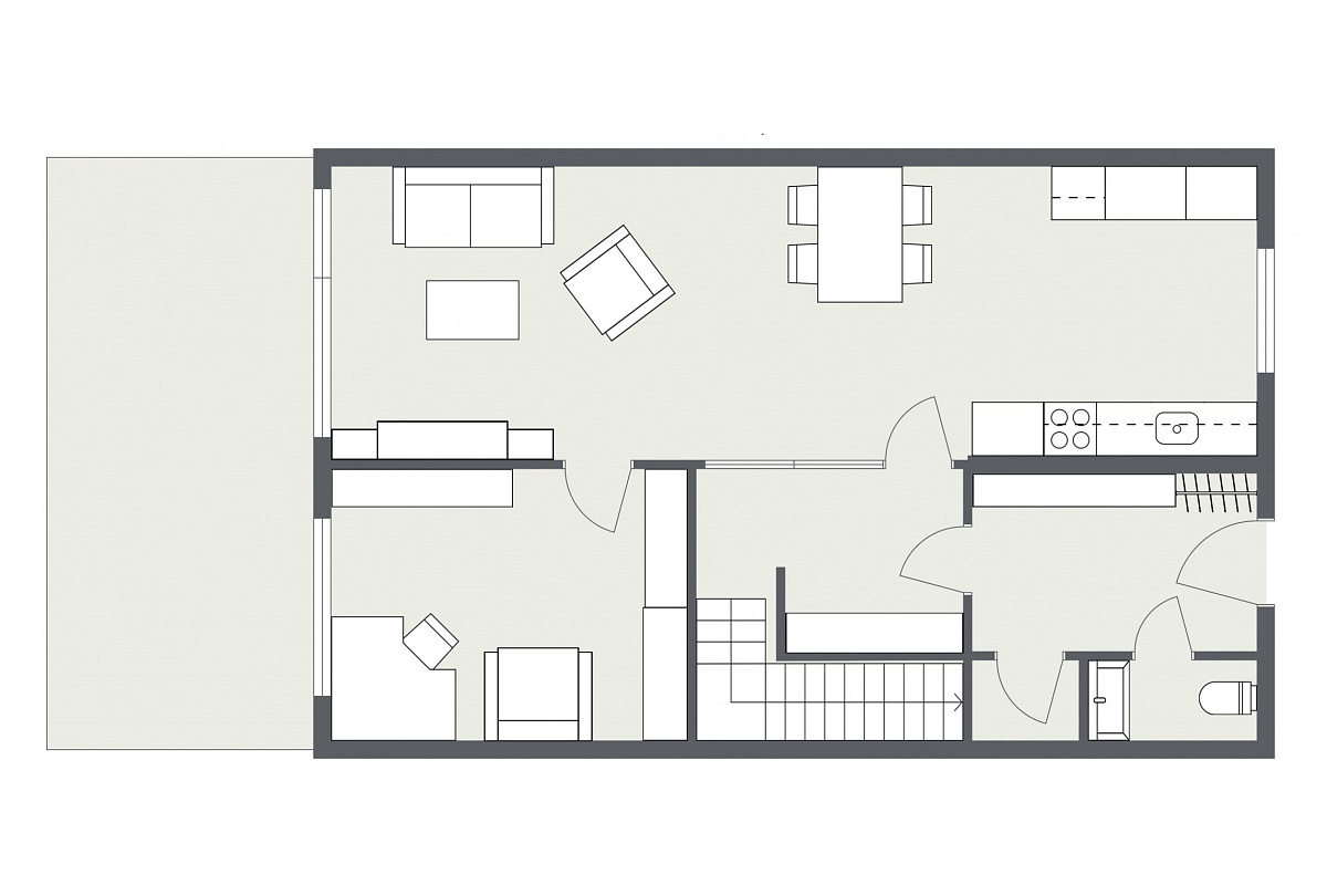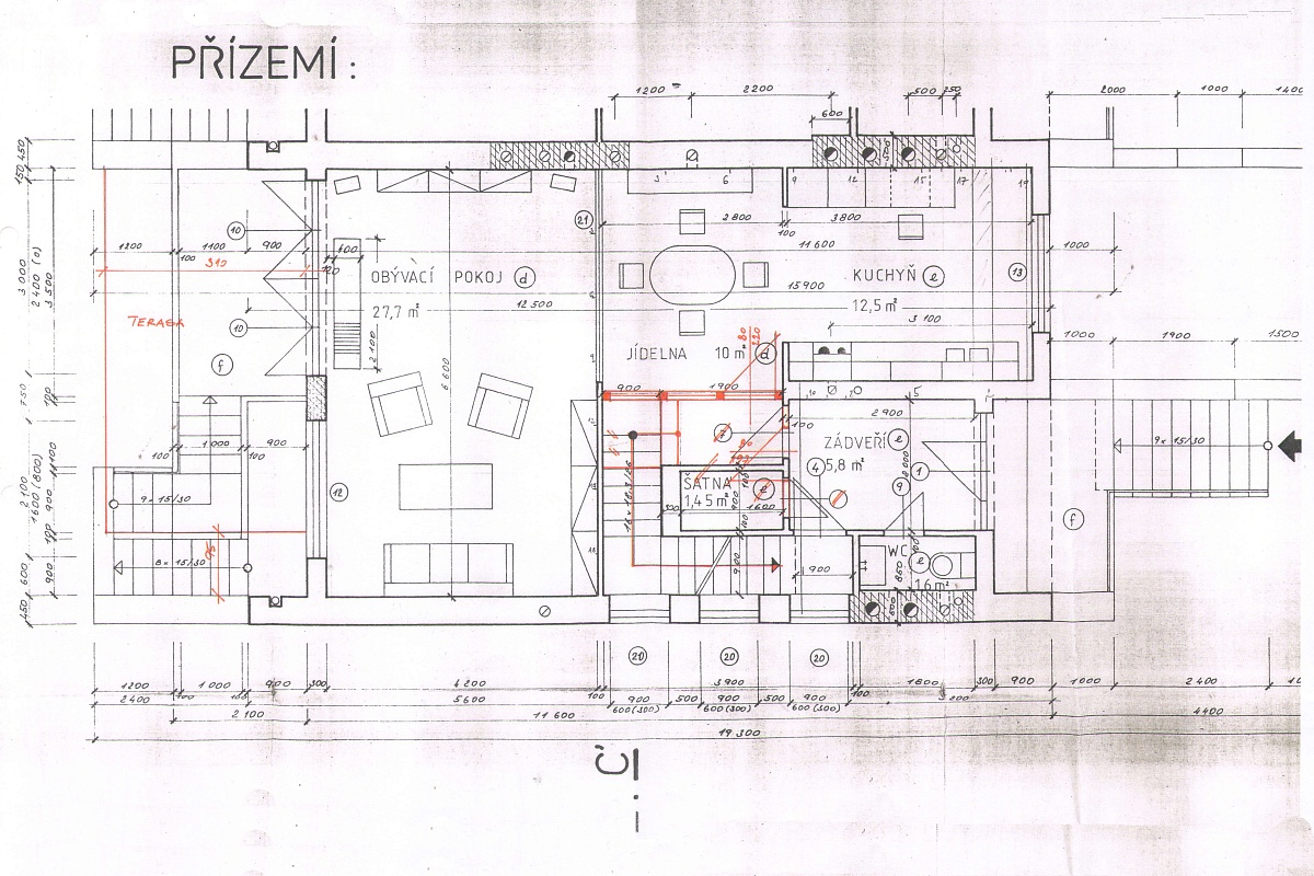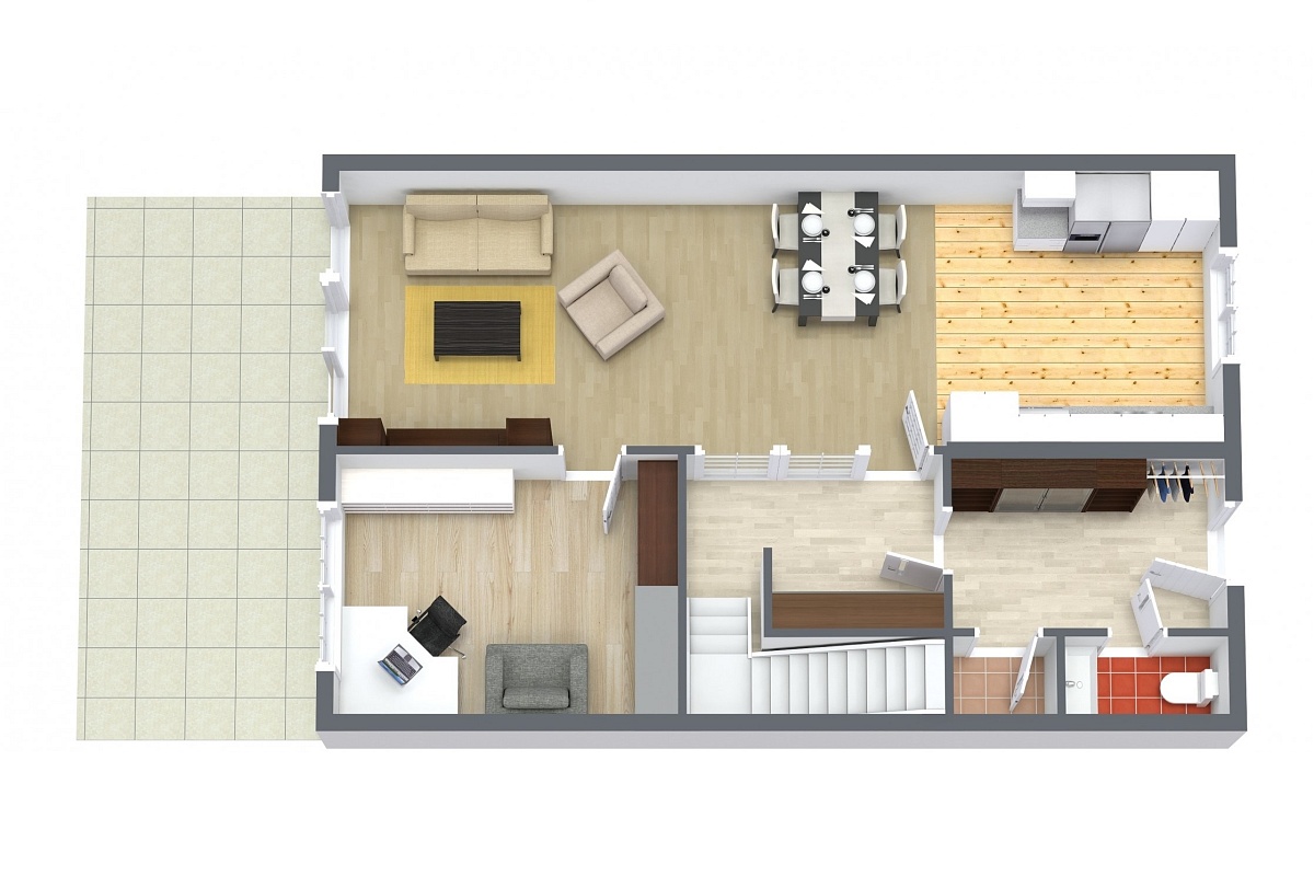 V přízemí domu se nachází vstupní chodba se šatní stěnou, toaleta s umyvadlem, schodiště do suterénu domu nebo do patra. V přízemí veliký obývací pokoj s kuchyňí, jídelnou a pracovnou. Z obývacího pokoje je vstup na terasu a z ní na zahradu.