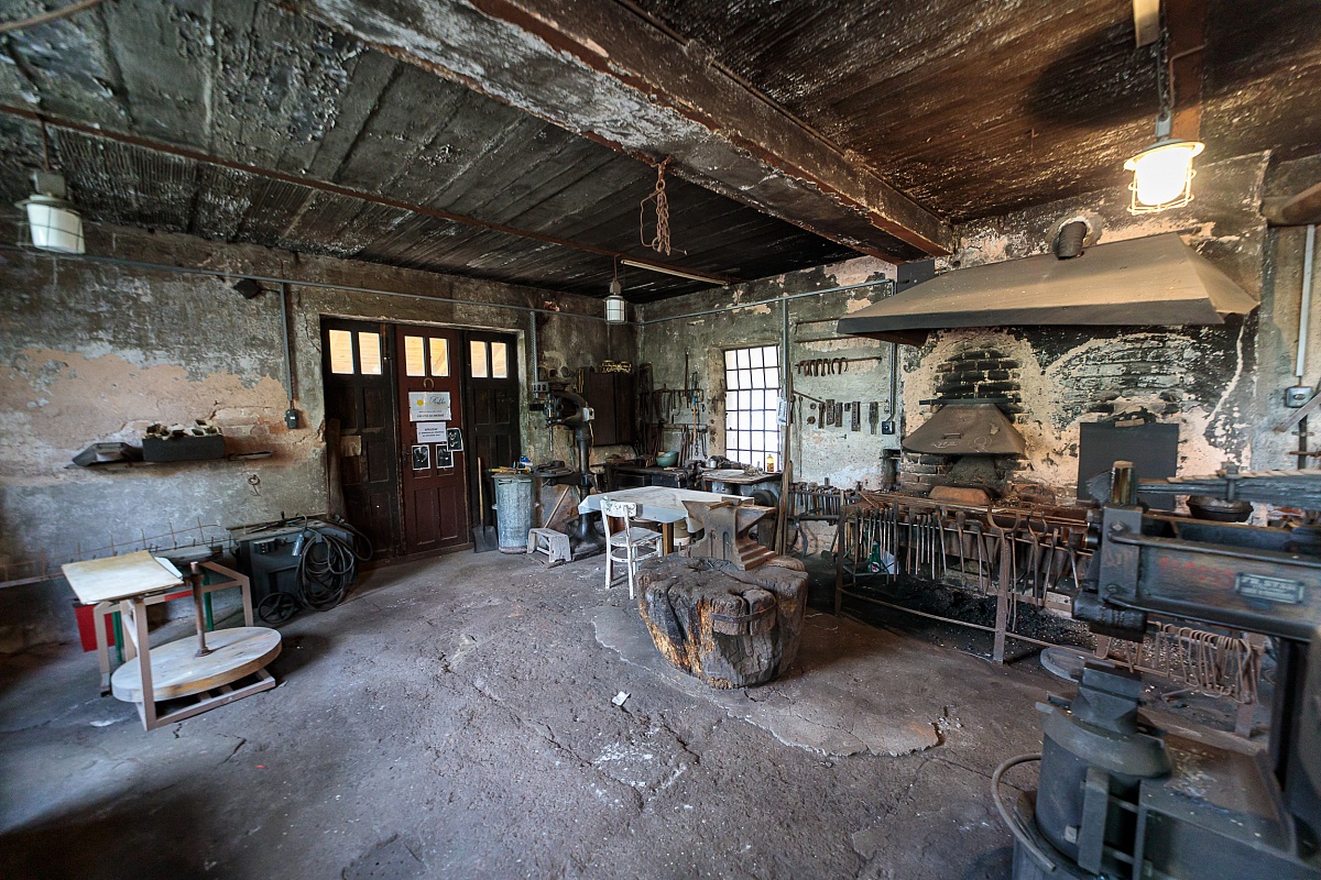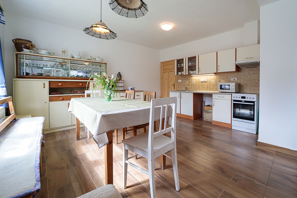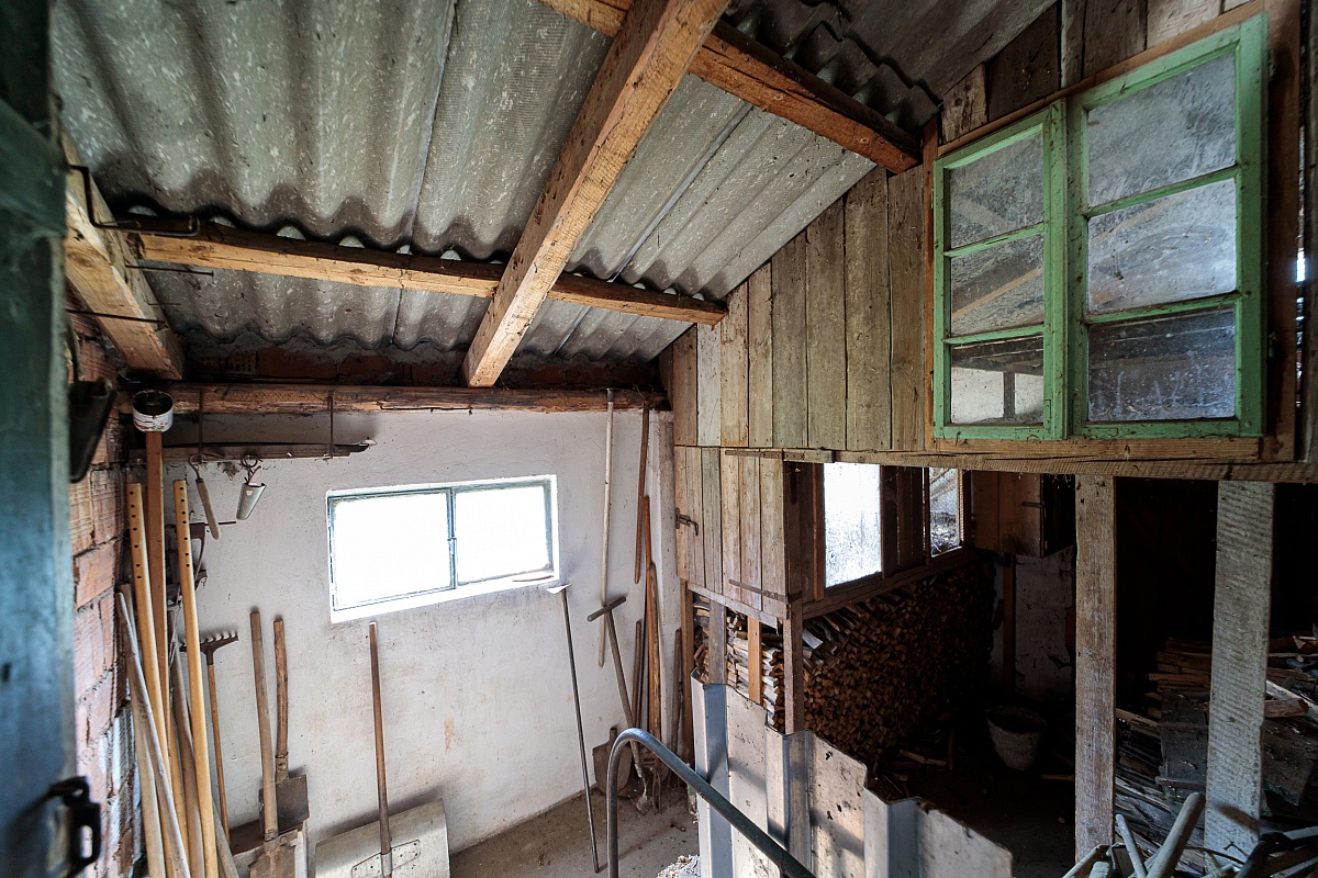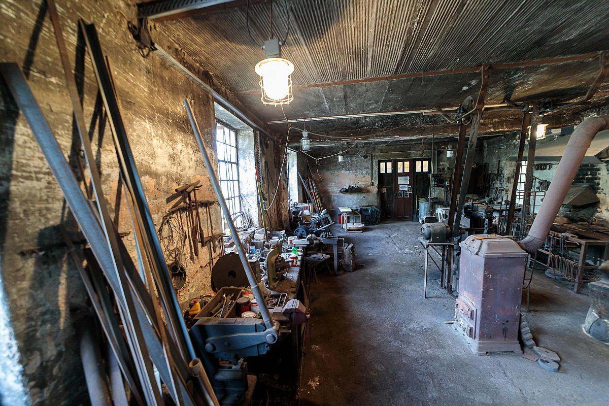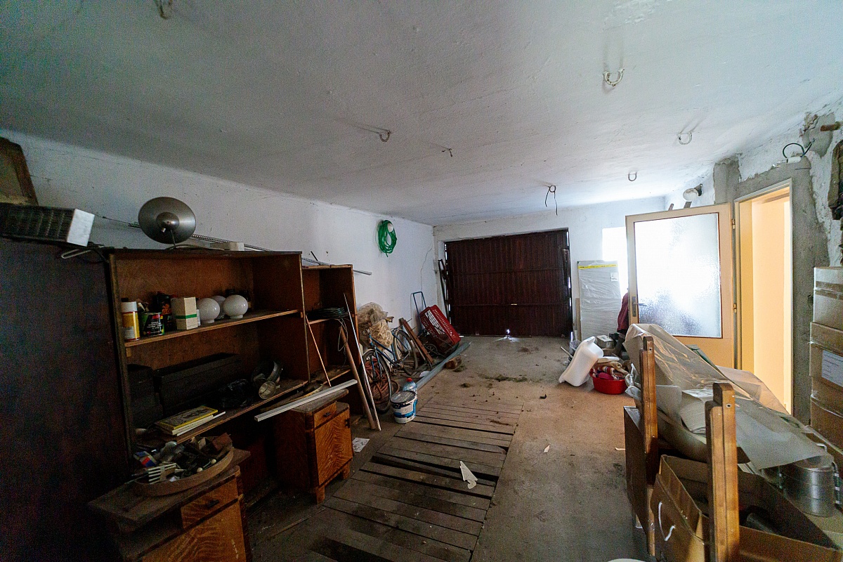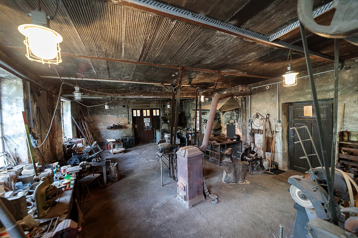 1. NP: velká obytná místnost s kuchyňkou s kuchyňskou linkou, koupelna se sprchovým koutem a umyvadlem, samostatné WC, garáž, veliká kovářská dílna, chodba a zádveří