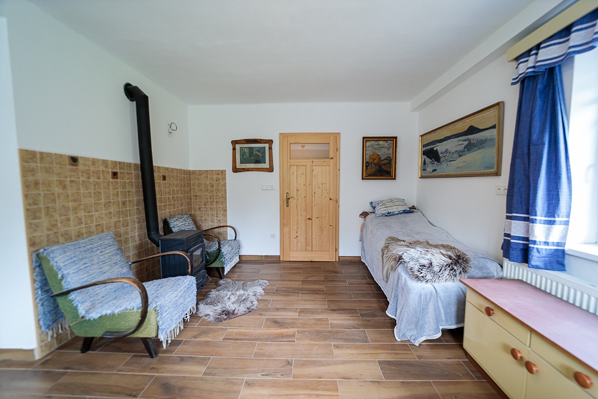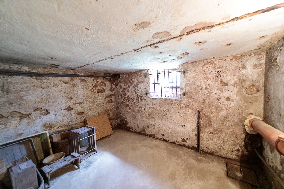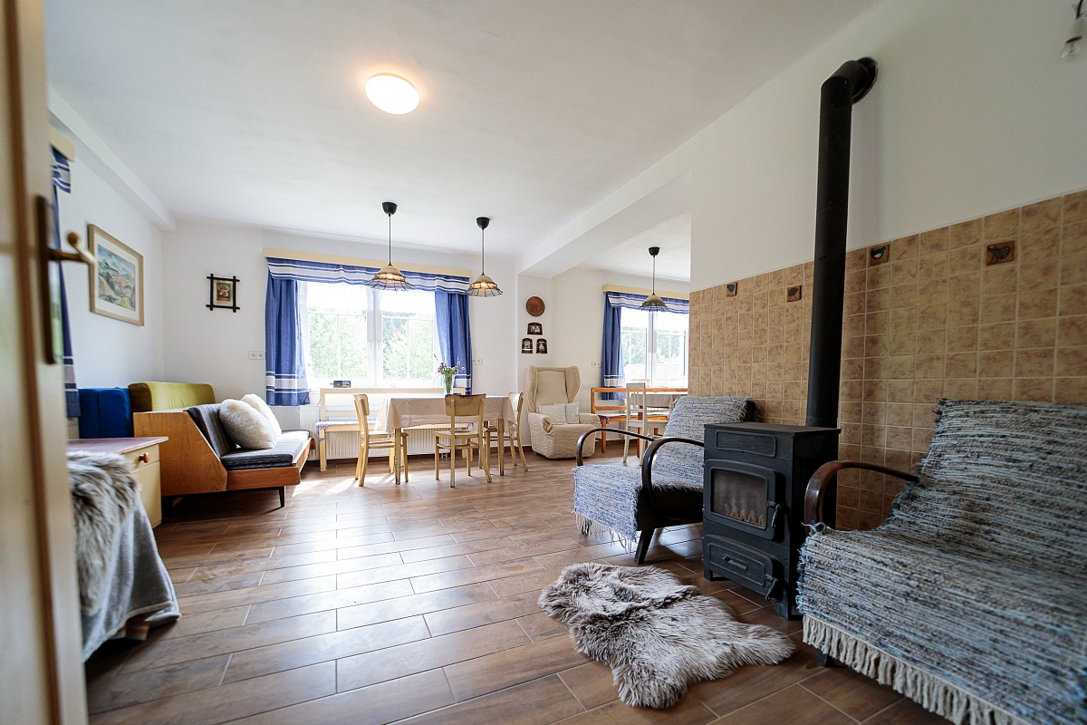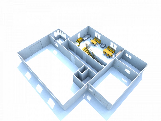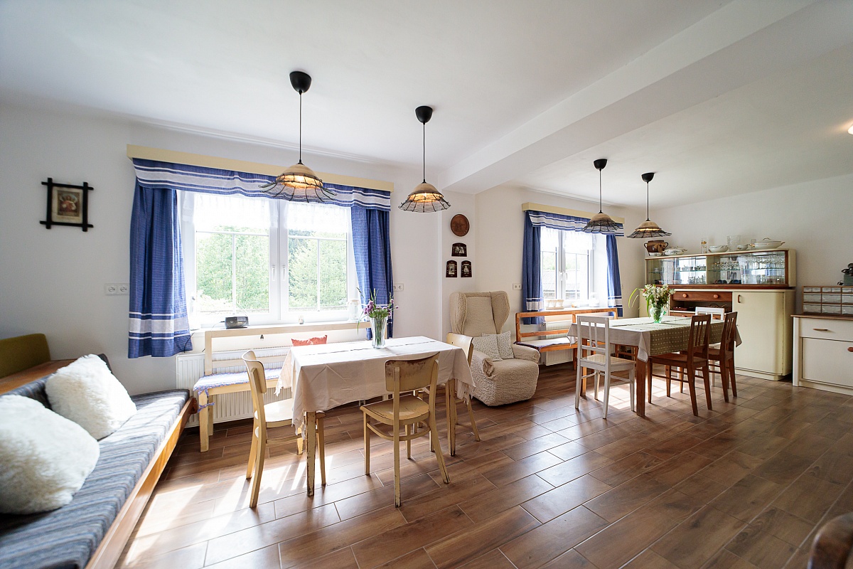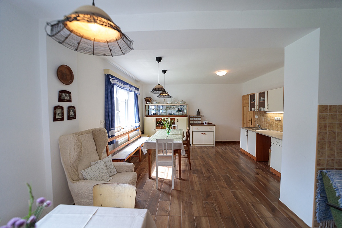 1. NP: velká obytná místnost s kuchyňkou s kuchyňskou linkou, koupelna se sprchovým koutem a umyvadlem, samostatné WC, garáž, veliká kovářská dílna, chodba a zádveří