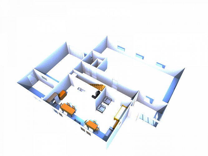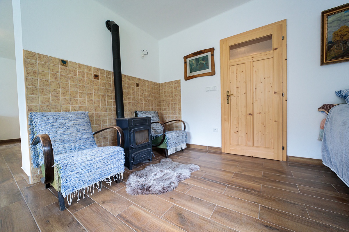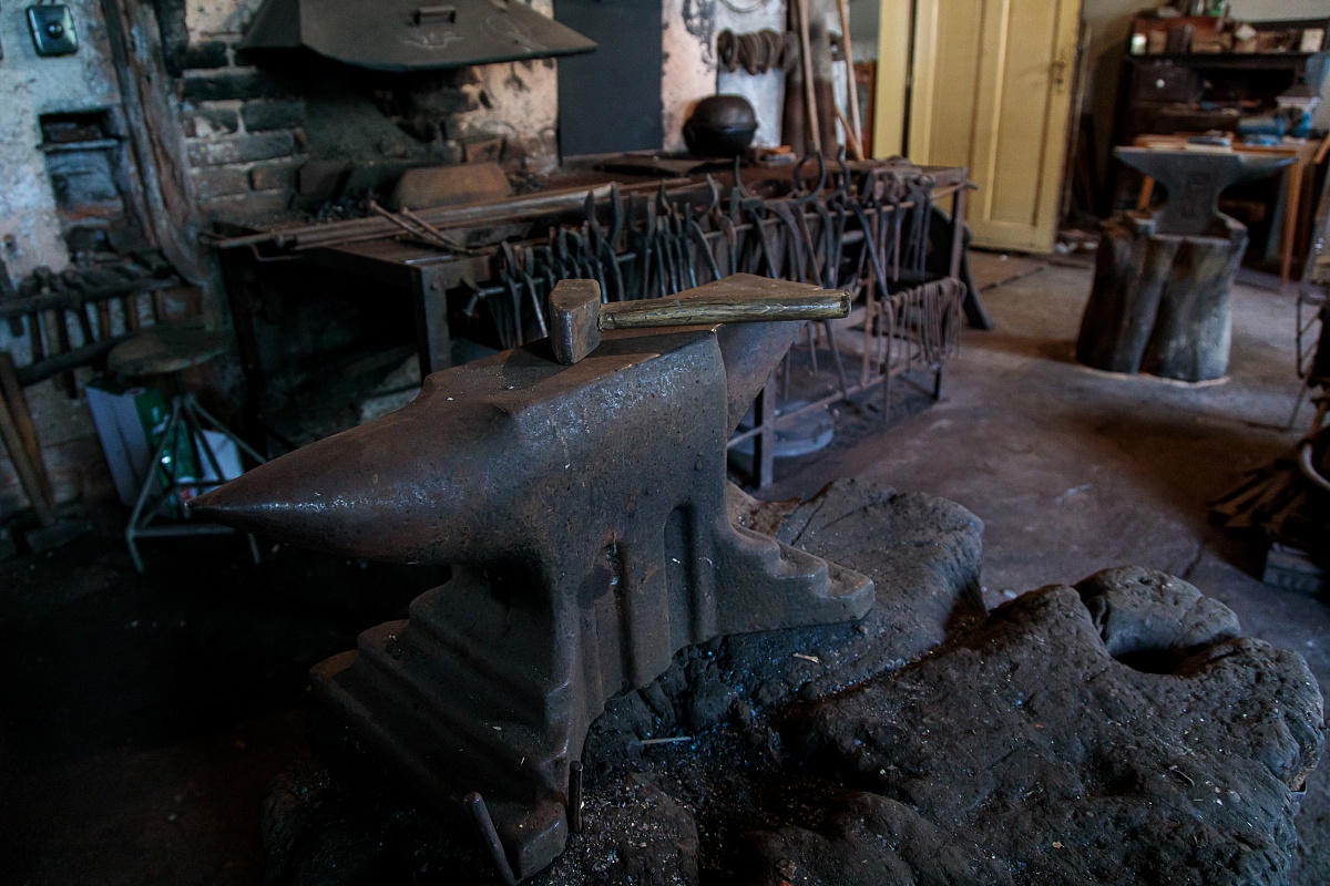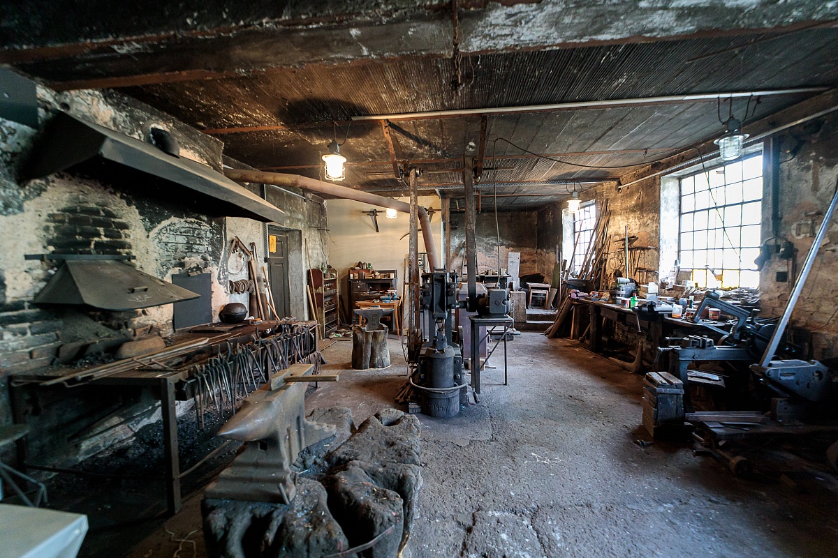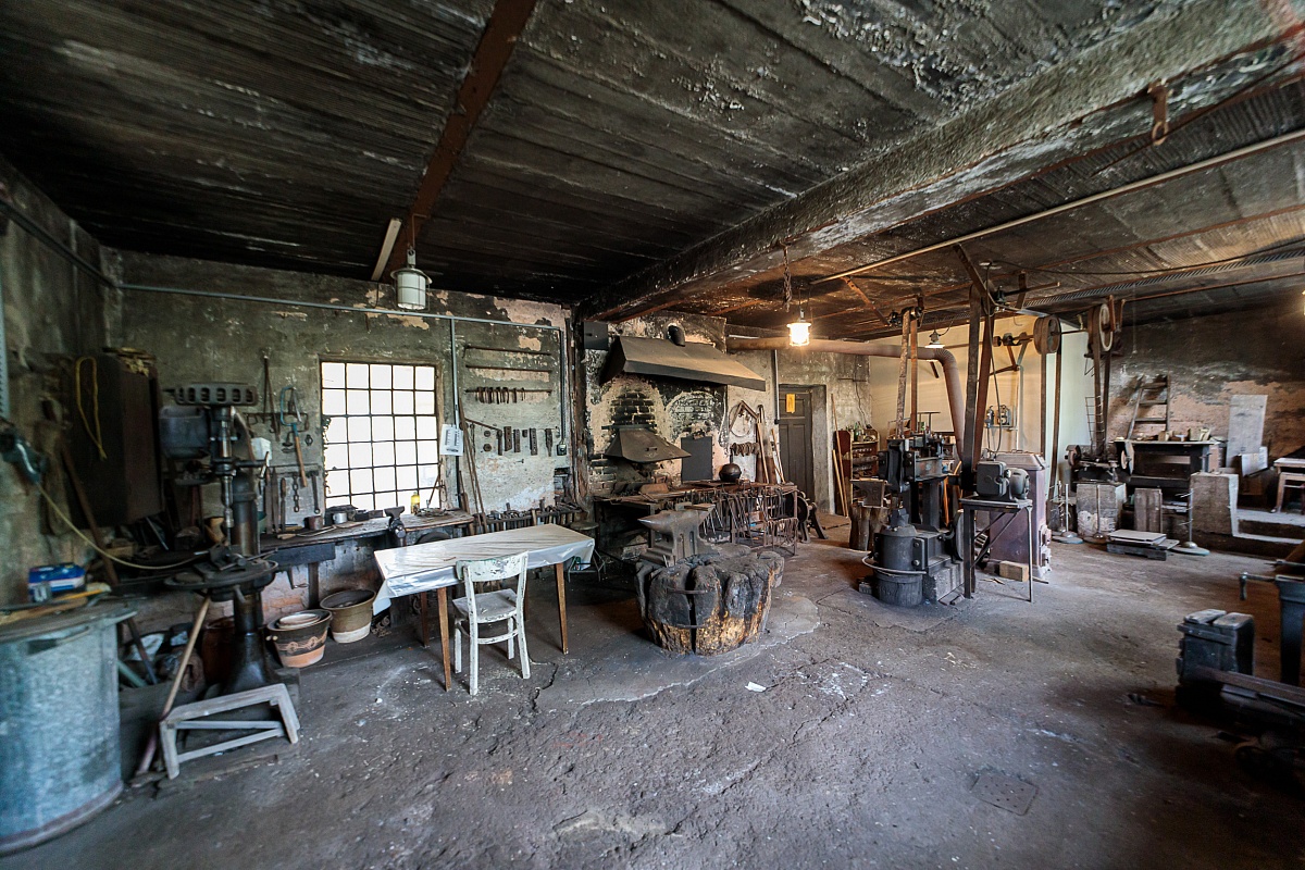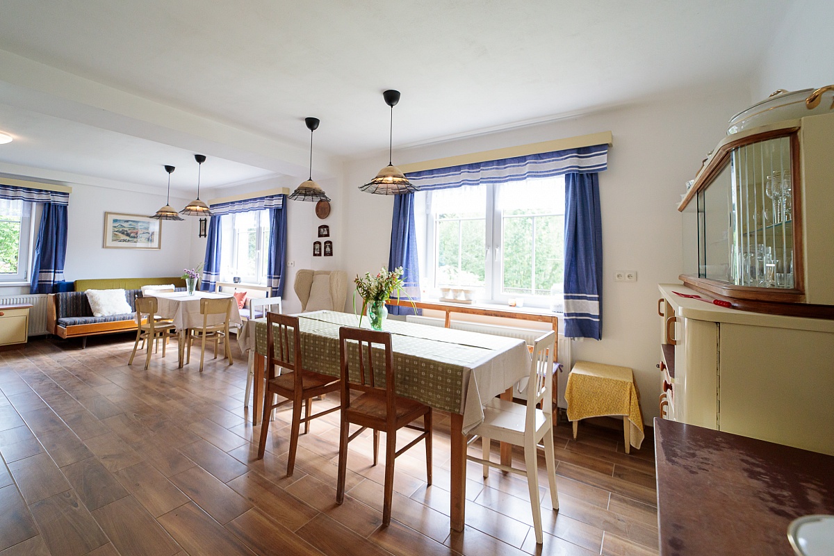 1. NP: velká obytná místnost s kuchyňkou s kuchyňskou linkou, koupelna se sprchovým koutem a umyvadlem, samostatné WC, garáž, veliká kovářská dílna, chodba a zádveří