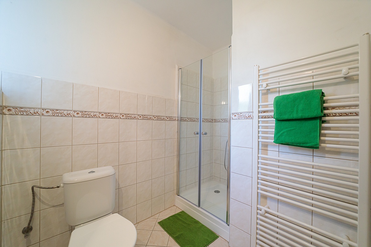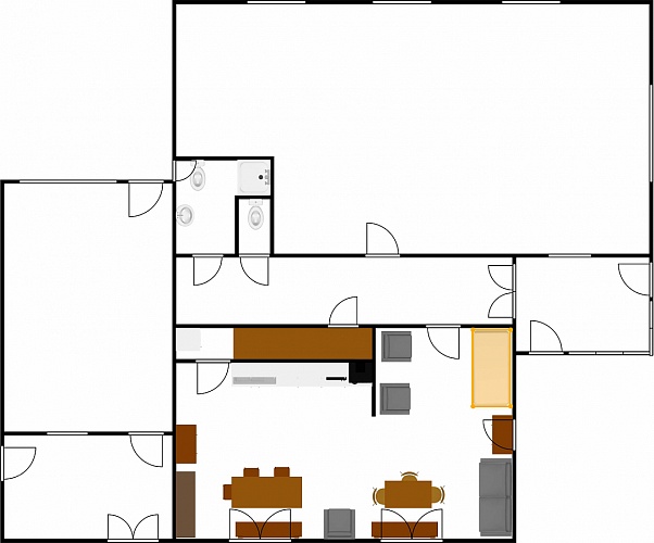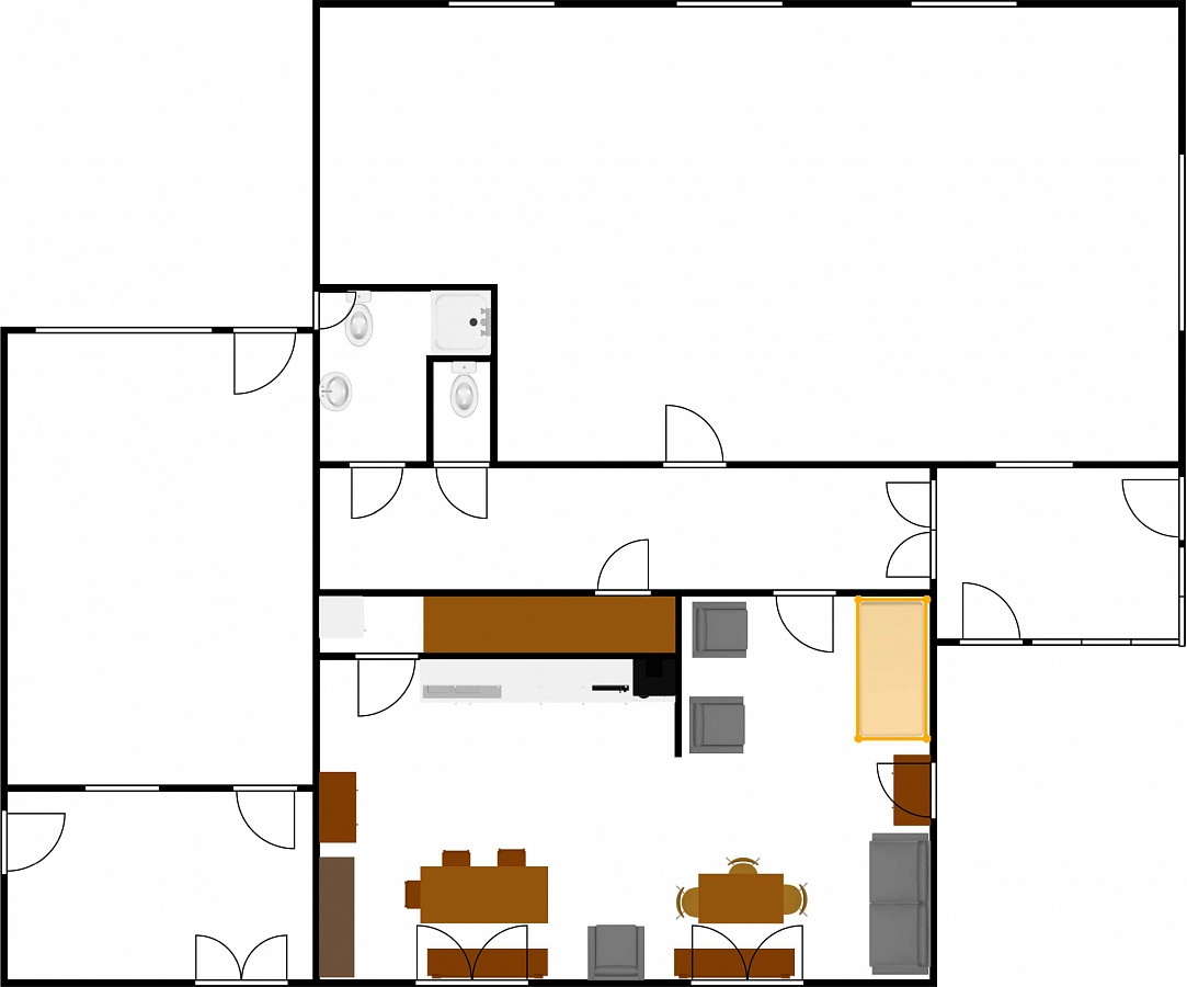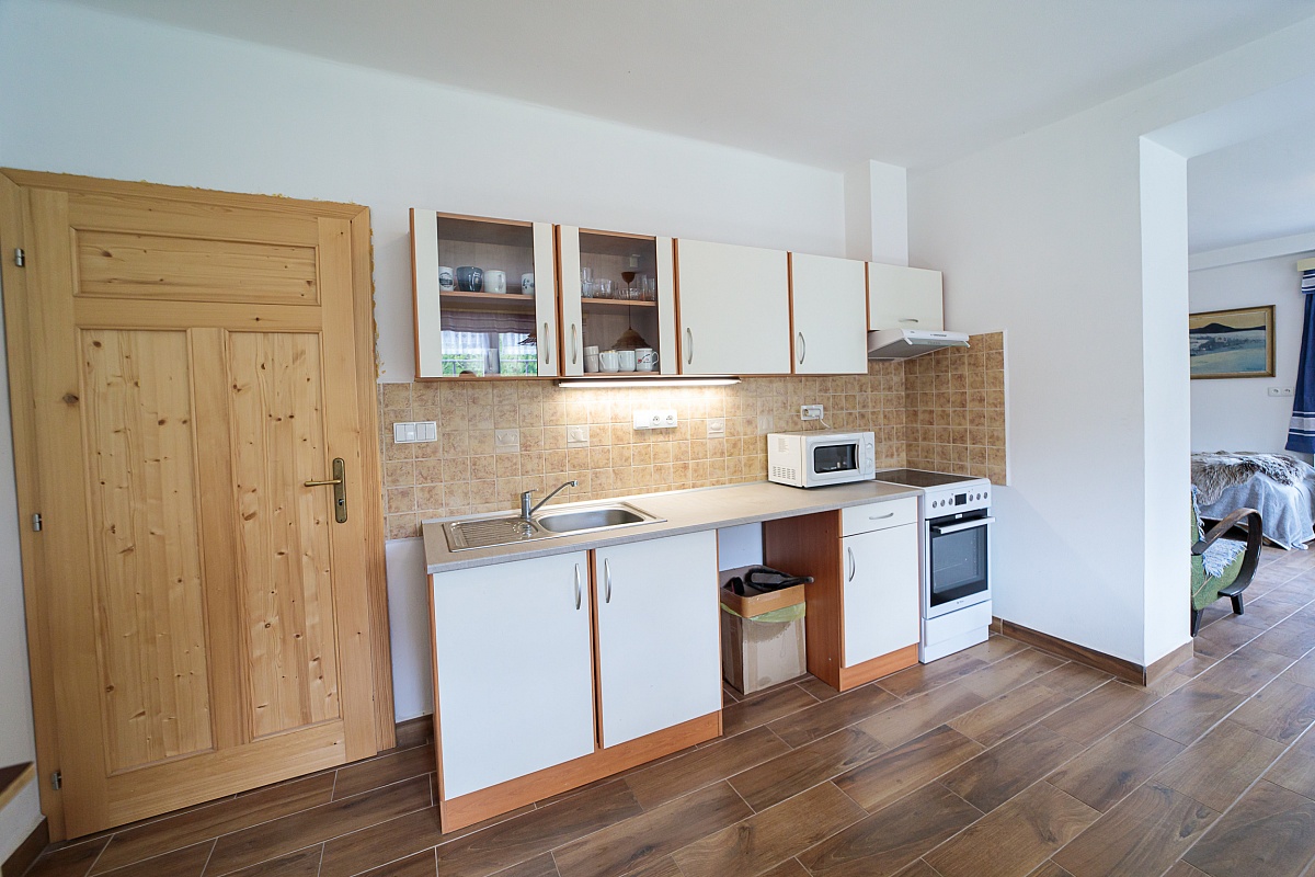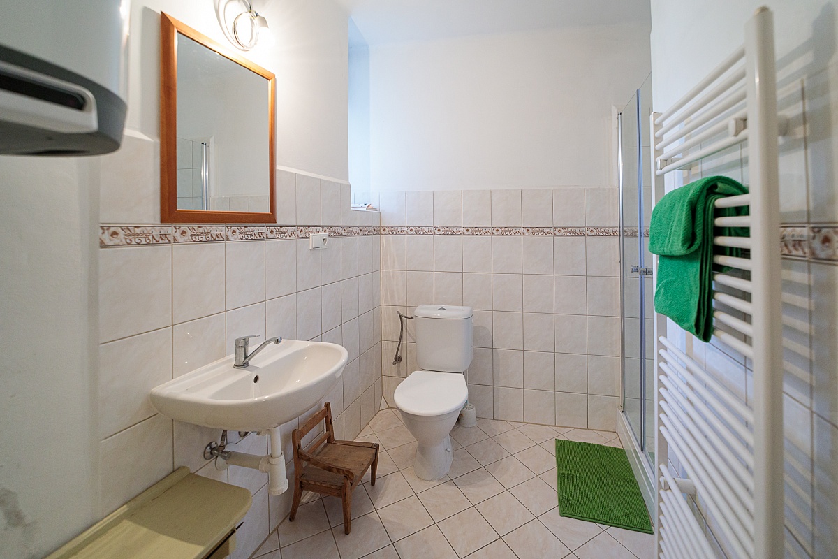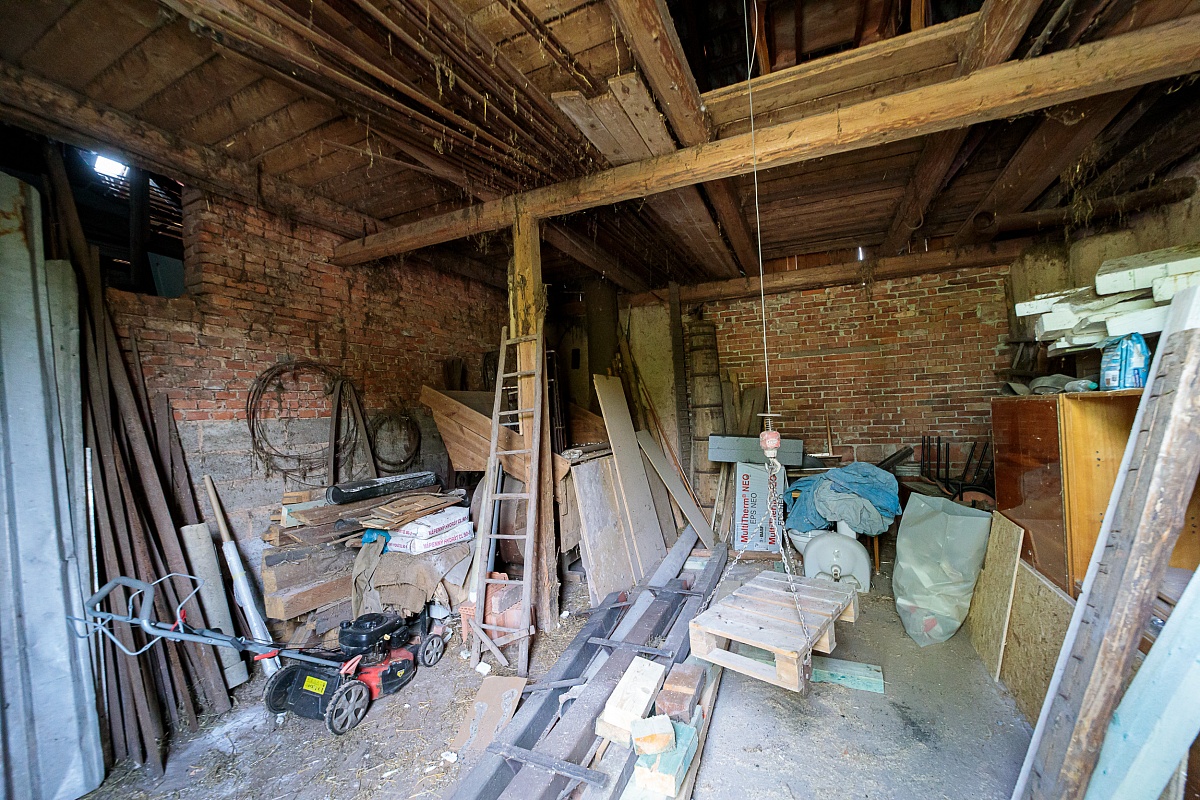 1. NP: velká obytná místnost s kuchyňkou s kuchyňskou linkou, koupelna se sprchovým koutem a umyvadlem, samostatné WC, garáž, veliká kovářská dílna, chodba a zádveří